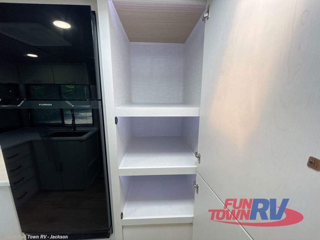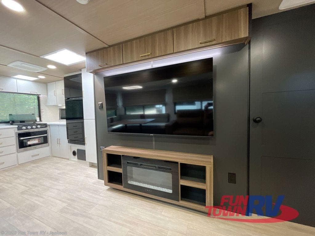 There is so much space in this Vibe travel trailer! Two bedrooms mean you can always find a quiet spot. The bunkroom has a versa queen bed plus a 30" x 74" bunk, with a wardrobe and shelves. The sliding door saves floor space in your living room. Up front you will find a main bedroom with a king bed in a slide for even more room, plus a full-width walk-in closet for maximum storage. Don't overlook the underbed storage and dresser too! The common area features an L-shaped 5-person dinette and a tri-fold sofa, cozily arranged around the entertainment center with TV and fireplace. And to top it all off, the rear kitchen provides a great space for the cook - out of the way but with everything you might need! A large pantry, sink, electric oven will be perfect for meal prep. A skylight lets you enjoy the weather while you cook.