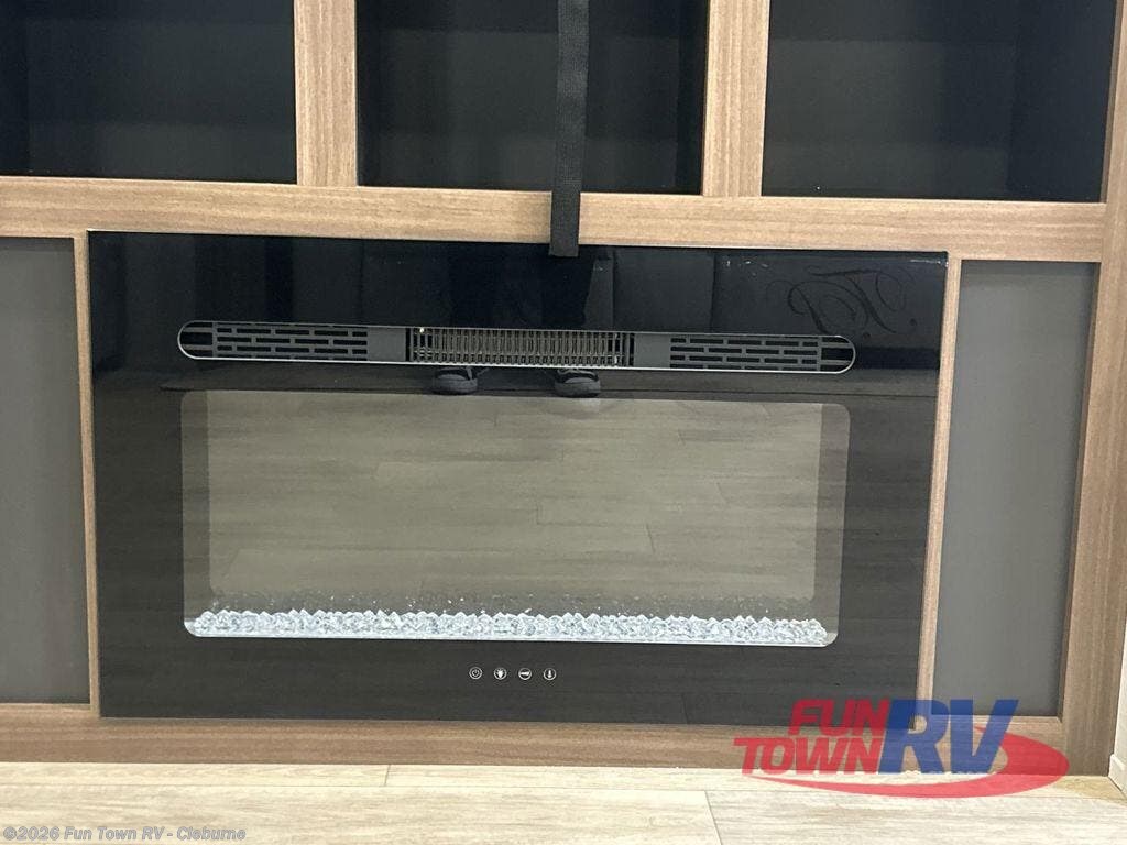 You won't believe all that this travel trailer has to offer! The rear kitchen includes a spacious pantry and a coffee bar/hutch for additional storage space. The kitchen island makes meal prepping easier, and the beverage cooler helps save space in your refrigerator for perishables. The kitchen skylight brings in natural lighting. Relax each night on either the tri-fold sofa or theater seating across from the entertainment center with a fireplace, or you can play some games at the 5-person dinette. As you enter the bathroom, you will notice the washer and dryer prep that will give you the ability to add these appliances. The front private bedroom has a custom king bed slide with nightstands on either side with power to charge your electronics while you recharge. The exterior not only has pass-through storage and a power awning, but also a 64" x 20" baggage door!