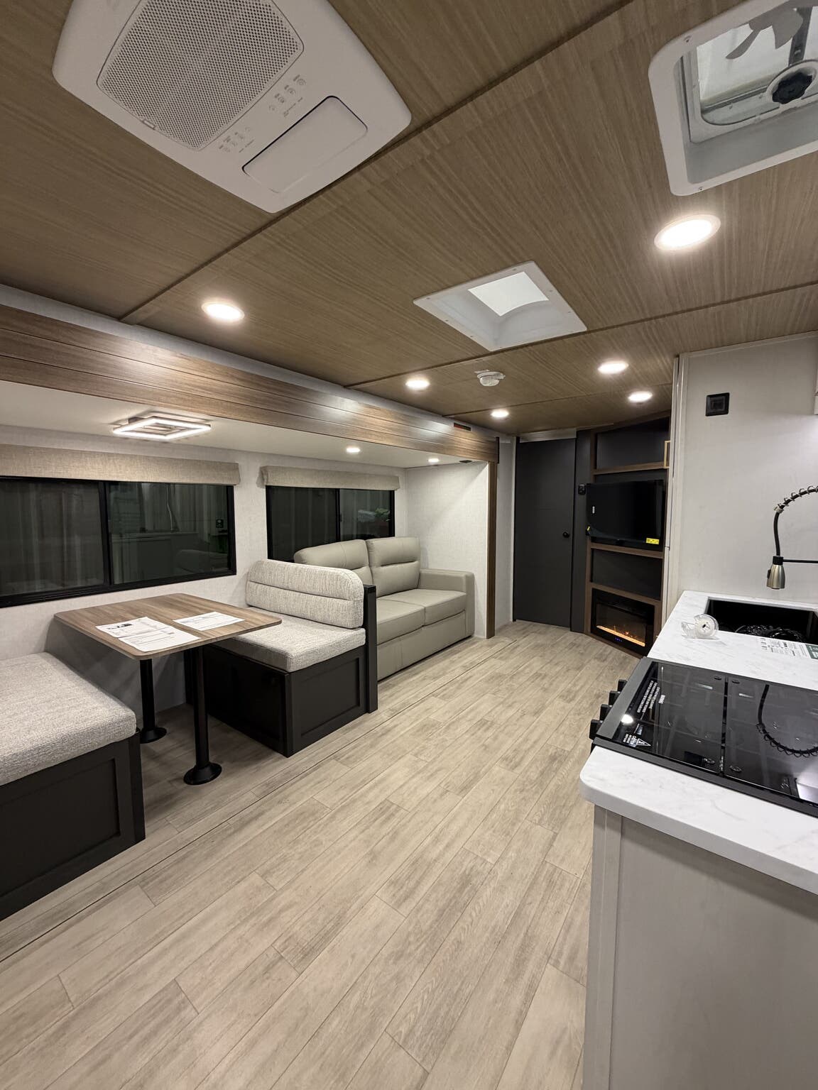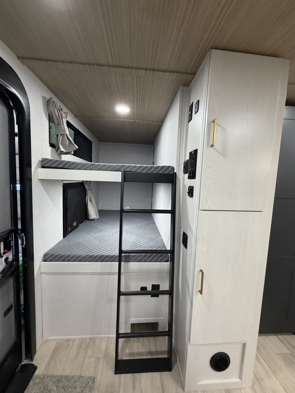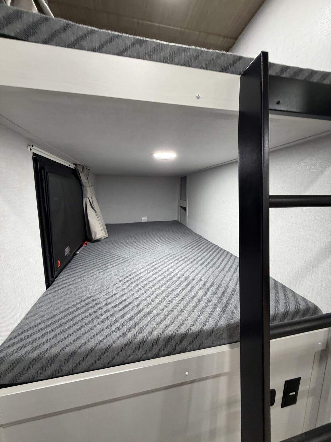 Great family bunkhouse! Popular model- sells quick! Large rear bunks tucked away taking up no living or bathroom space! Check out the spacious bathroom, comfortable dinette, comfortable sofa/sofa bed, entertainment center with large TV and fireplace, tons of natural light, 31.5BTU of cooling power, private front bedroom with large washer/dryer prepped closet, and more!