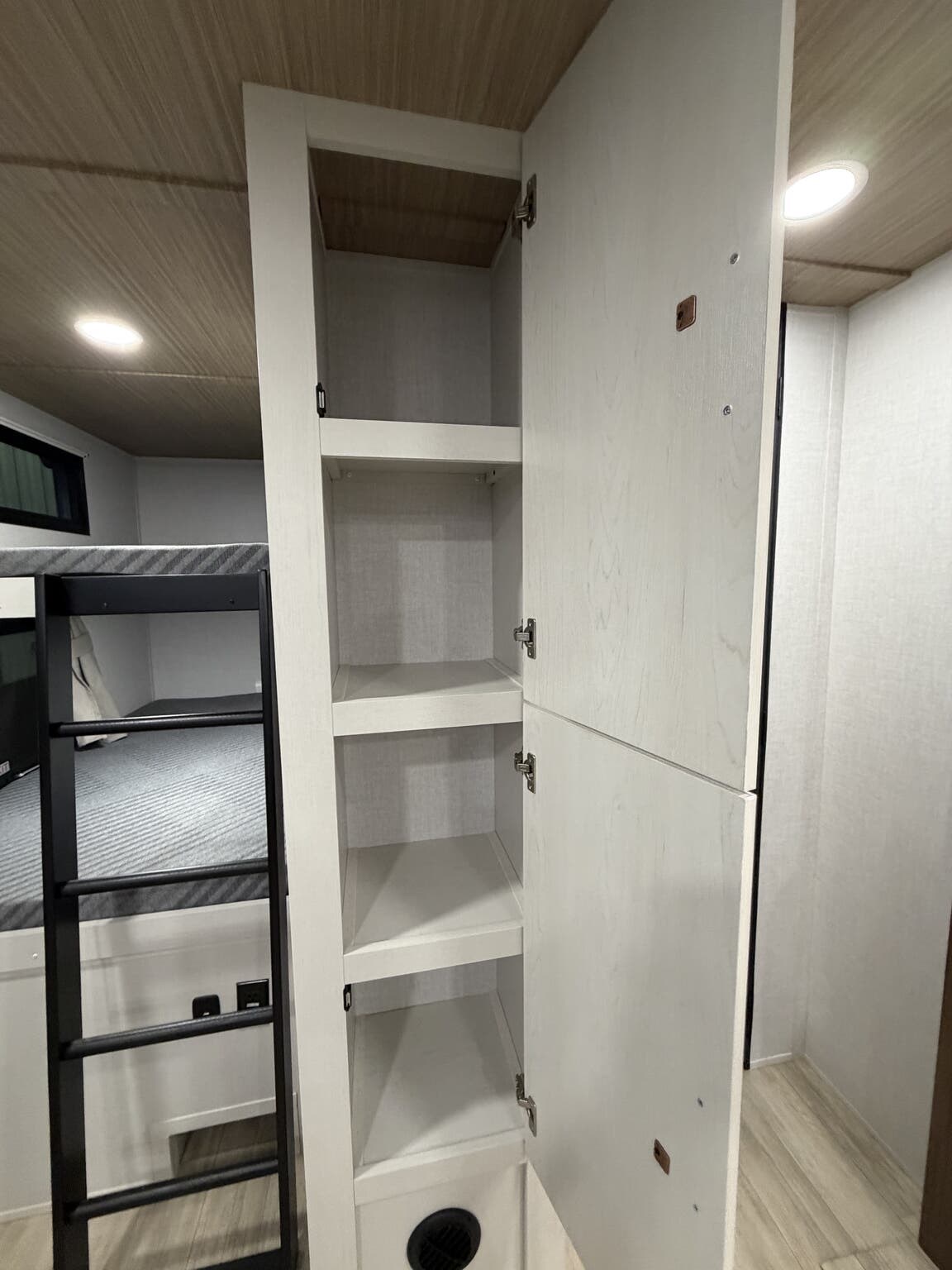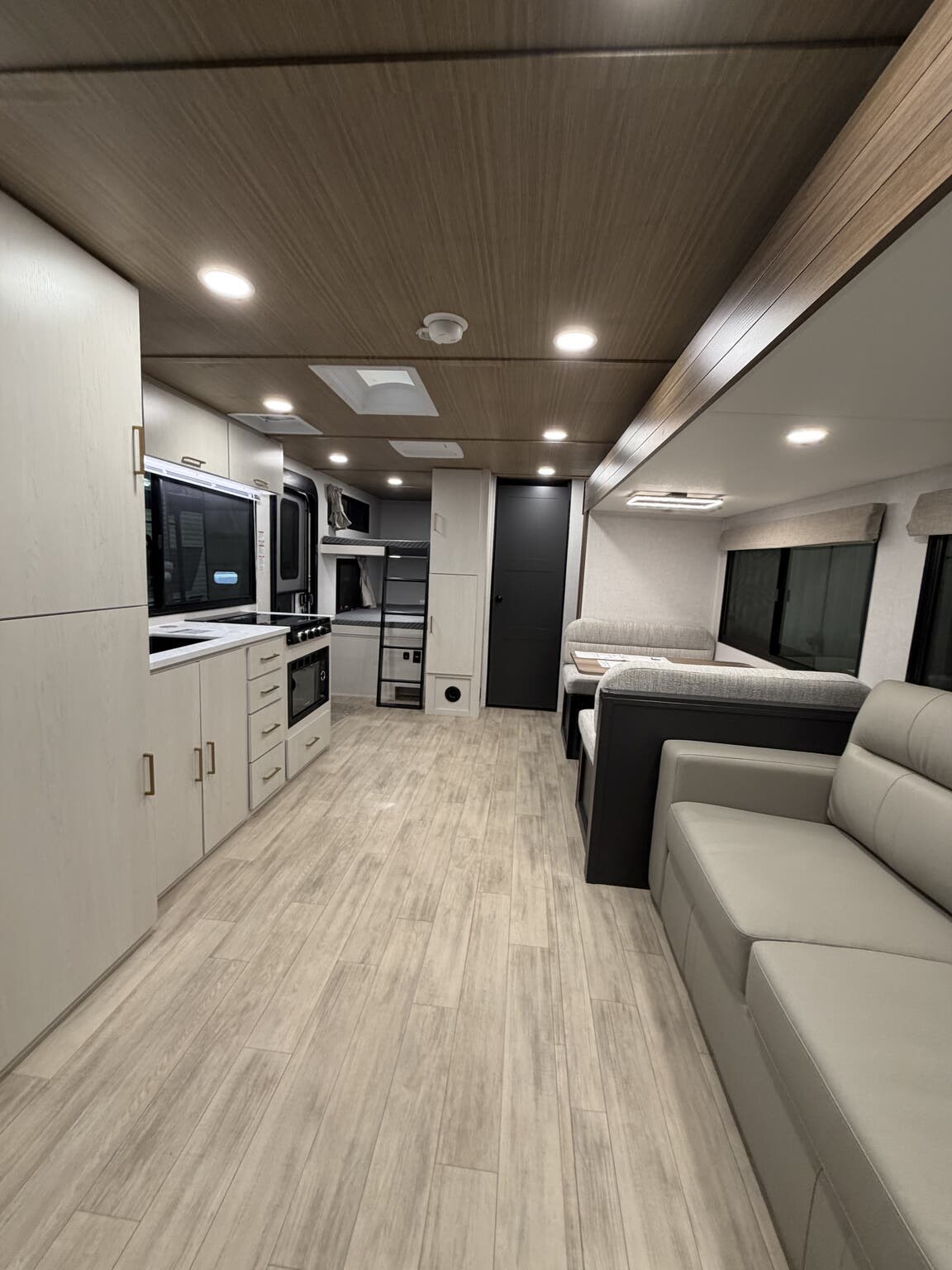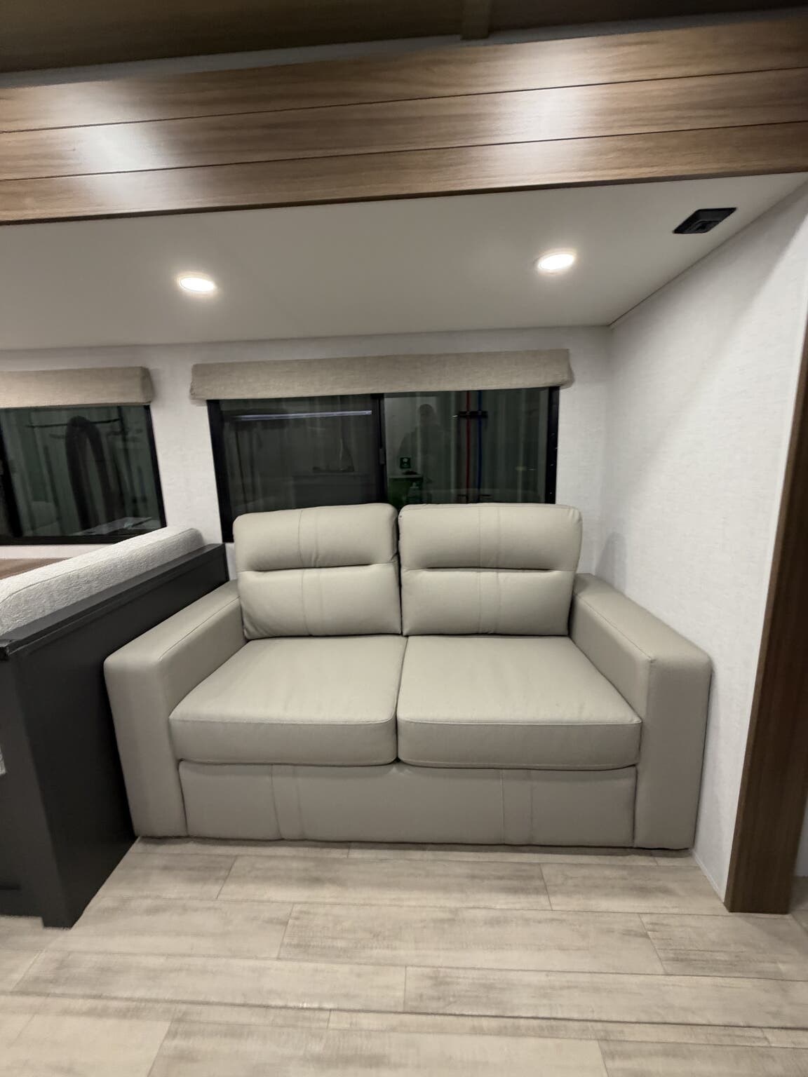 Great family bunkhouse! Popular model- sells quick! Large rear bunks tucked away taking up no living or bathroom space! Check out the spacious bathroom, comfortable dinette, comfortable sofa/sofa bed, entertainment center with large TV and fireplace, tons of natural light, 31.5BTU of cooling power, private front bedroom with large washer/dryer prepped closet, and more!
