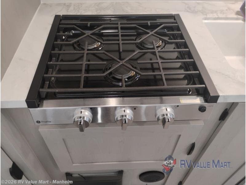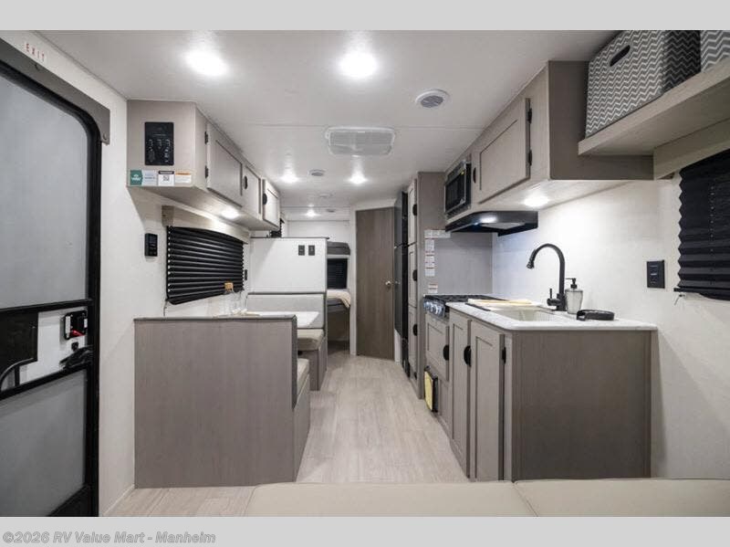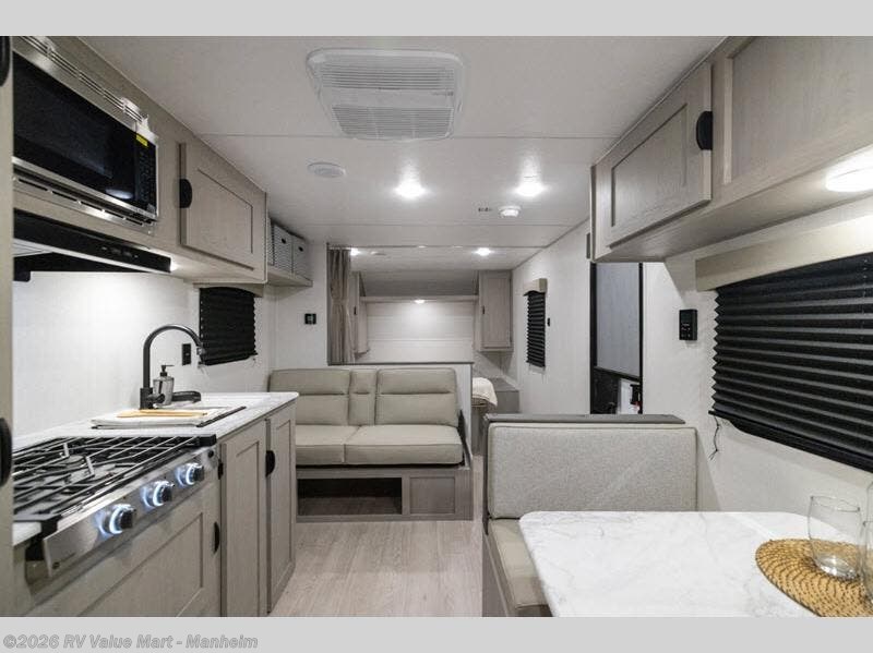 Bring the whole family with you in this travel trailer! The kiddos can sleep on the rear corner set of double-size bunks. The opposite rear corner features a full bath including a 24" x 36" shower, linen cabinet, toilet, and vanity. In the main living space, you will find plenty of seating with a booth dinette and jackknife sofa which can also transform into an extra sleeping space if needed. Everyone's bellies will stay full with the induction cooktop, 10 cu. ft. 12-volt refrigerator, and microwave which you can use to pop a bag of popcorn for movie night. You will enjoy the front bedroom for a bit of privacy including a queen bed and large overhead shelf for your things. On the outside, a large front pass-through for lawn chairs and camp gear. There is more storage beneath the bunks in back and a nice 15' awning to provide protection from the elements when outdoors.