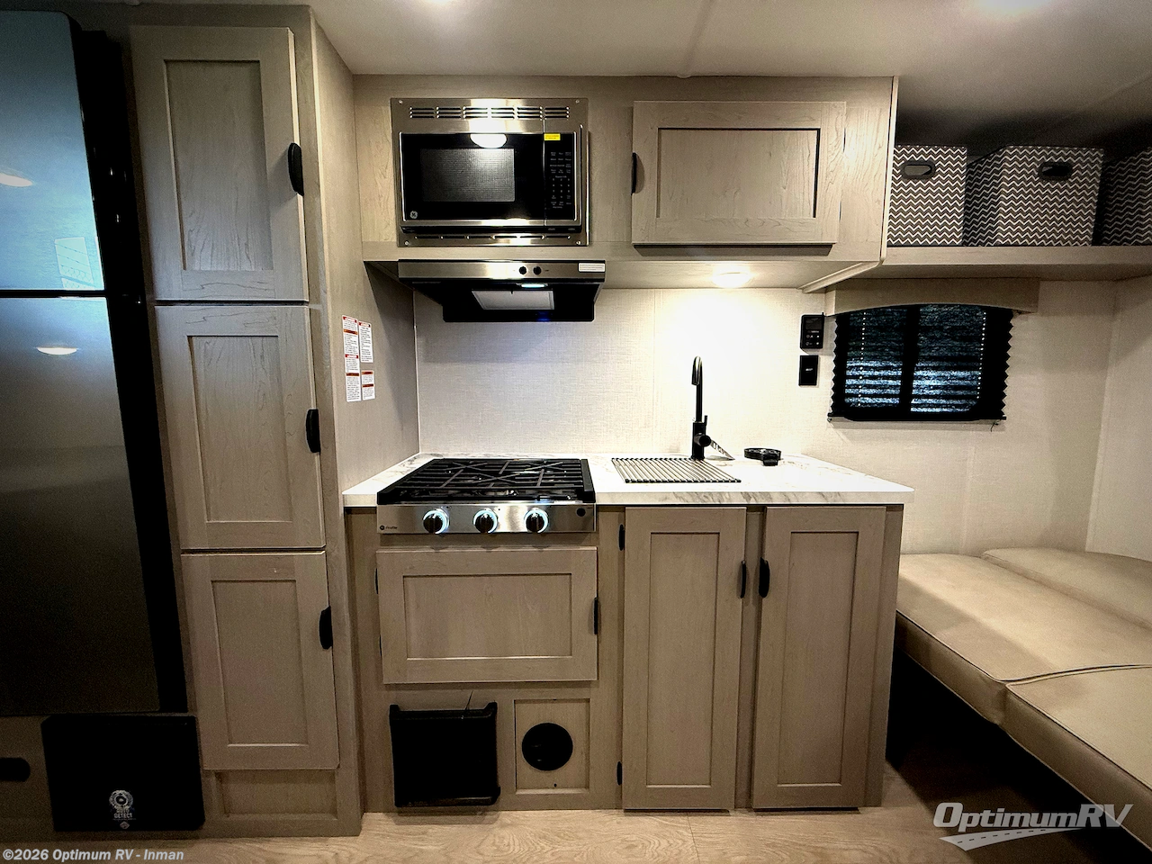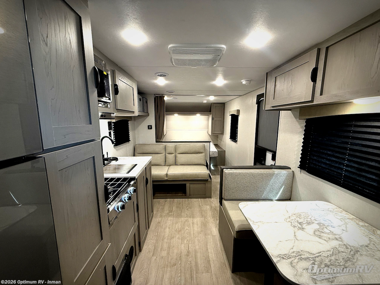 Bring the whole family with you in this travel trailer! The kiddos can sleep on the rear corner set of double-size bunks. The opposite rear corner features a full bath including a 24" x 36" shower, linen cabinet, toilet, and vanity. In the main living space, you will find plenty of seating with a booth dinette and jackknife sofa which can also transform into an extra sleeping space if needed. Everyone's bellies will stay full with the induction cooktop, 10 cu. ft. 12-volt refrigerator, and microwave which you can use to pop a bag of popcorn for movie night. You will enjoy the front bedroom for a bit of privacy including a queen bed and large overhead shelf for your things. On the outside, a large front pass-through for lawn chairs and camp gear. There is more storage beneath the bunks in back and a nice 15' awning to provide protection from the elements when outdoors.