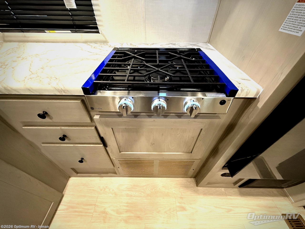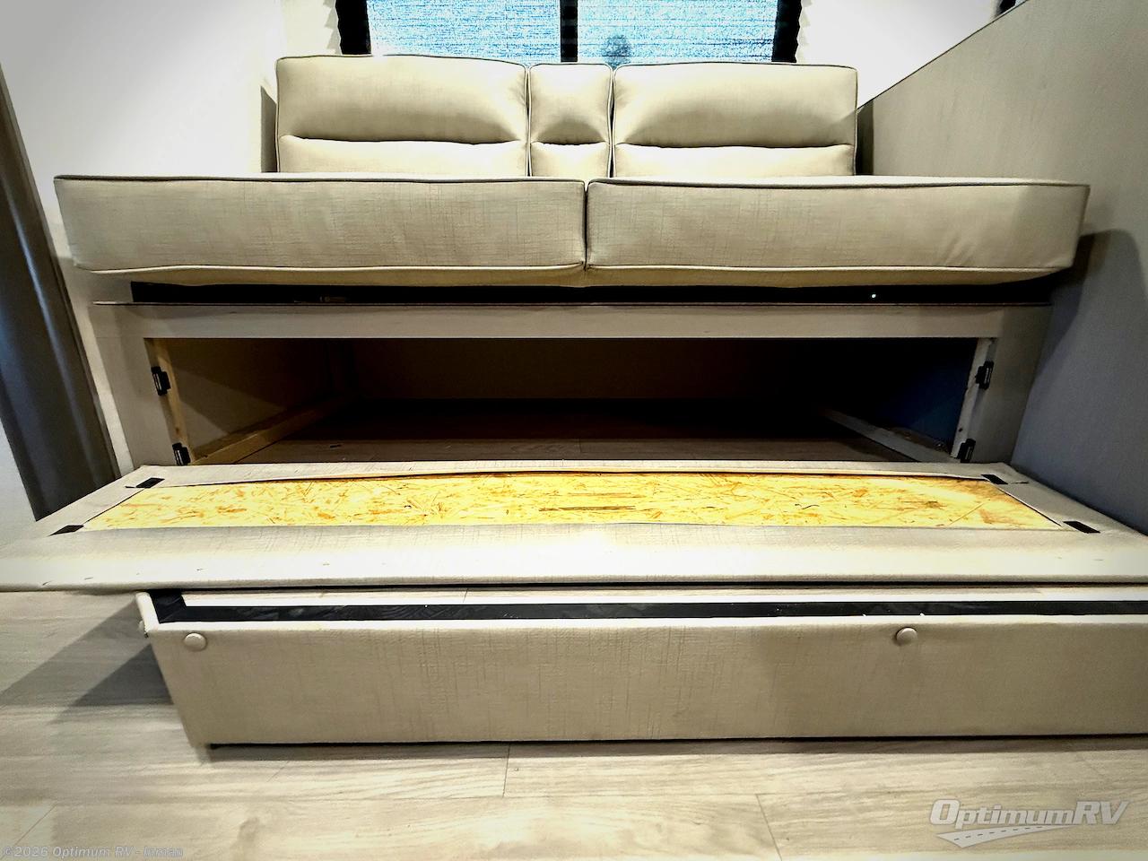 At the front of the trailer, a private bedroom welcomes you with a comfortable 60" x 80" queen bed for a restful night’s sleep, along with wardrobes on each side and an overhead shelf for organized storage. A convenient entry door provides direct access to this cozy space. Moving through the pass-through full bathroom, you’ll find storage beneath the countertop for toiletries and a 32" x 32" shower with a glass door, perfect for unwinding after a full day of adventure. At the center of the trailer, the main living area and kitchen create a spacious and functional hub, featuring a sofa and U-shaped dinette housed in a slide-out for plenty of seating space, while the fully equipped kitchen includes a sink with drying rack, a three-burner cooktop, and a 10 cu. ft. refrigerator so you can cook like a chef. Next to the second entry door, a walk-in pantry offers abundant space for dry goods and supplies. At the rear, two private bunk rooms each include a 38" x 72" bunk, dedicated storage, and a flip-up desk, ideal for work, study, or quiet time.