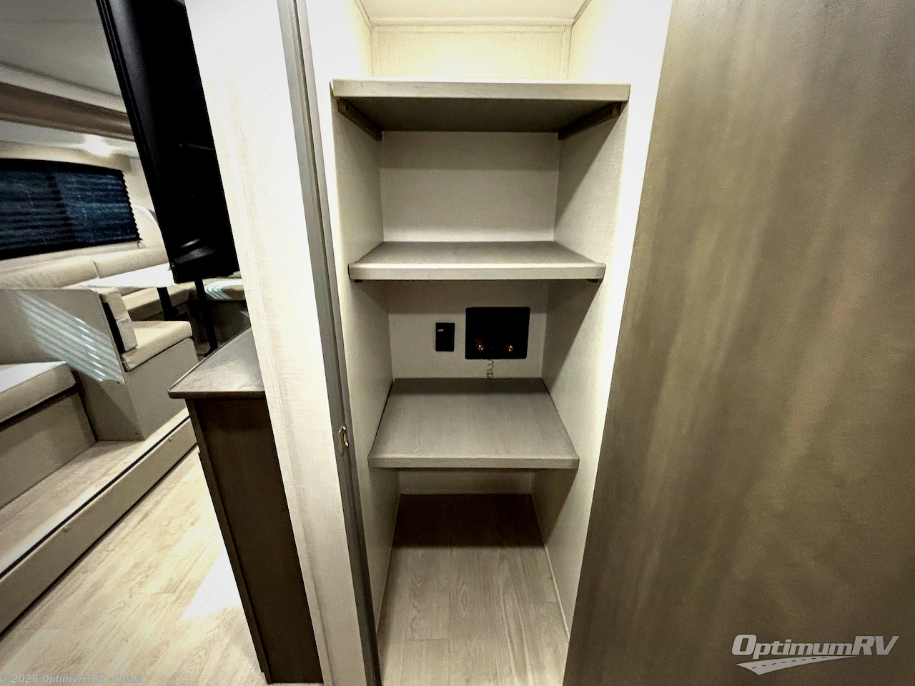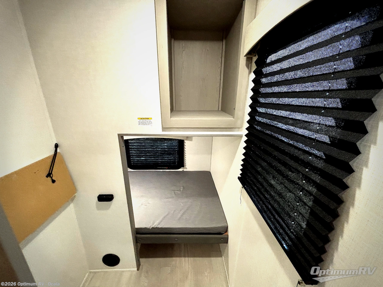 At the front of the trailer, a private bedroom welcomes you with a comfortable 60" x 80" queen bed for a restful night’s sleep, along with wardrobes on each side and an overhead shelf for organized storage. A convenient entry door provides direct access to this cozy space. Moving through the pass-through full bathroom, you’ll find storage beneath the countertop for toiletries and a 32" x 32" shower with a glass door, perfect for unwinding after a full day of adventure. At the center of the trailer, the main living area and kitchen create a spacious and functional hub, featuring a sofa and U-shaped dinette housed in a slide-out for plenty of seating space, while the fully equipped kitchen includes a sink with drying rack, a three-burner cooktop, and a 10 cu. ft. refrigerator so you can cook like a chef. Next to the second entry door, a walk-in pantry offers abundant space for dry goods and supplies. At the rear, two private bunk rooms each include a 38" x 72" bunk, dedicated storage, and a flip-up desk, ideal for work, study, or quiet time.