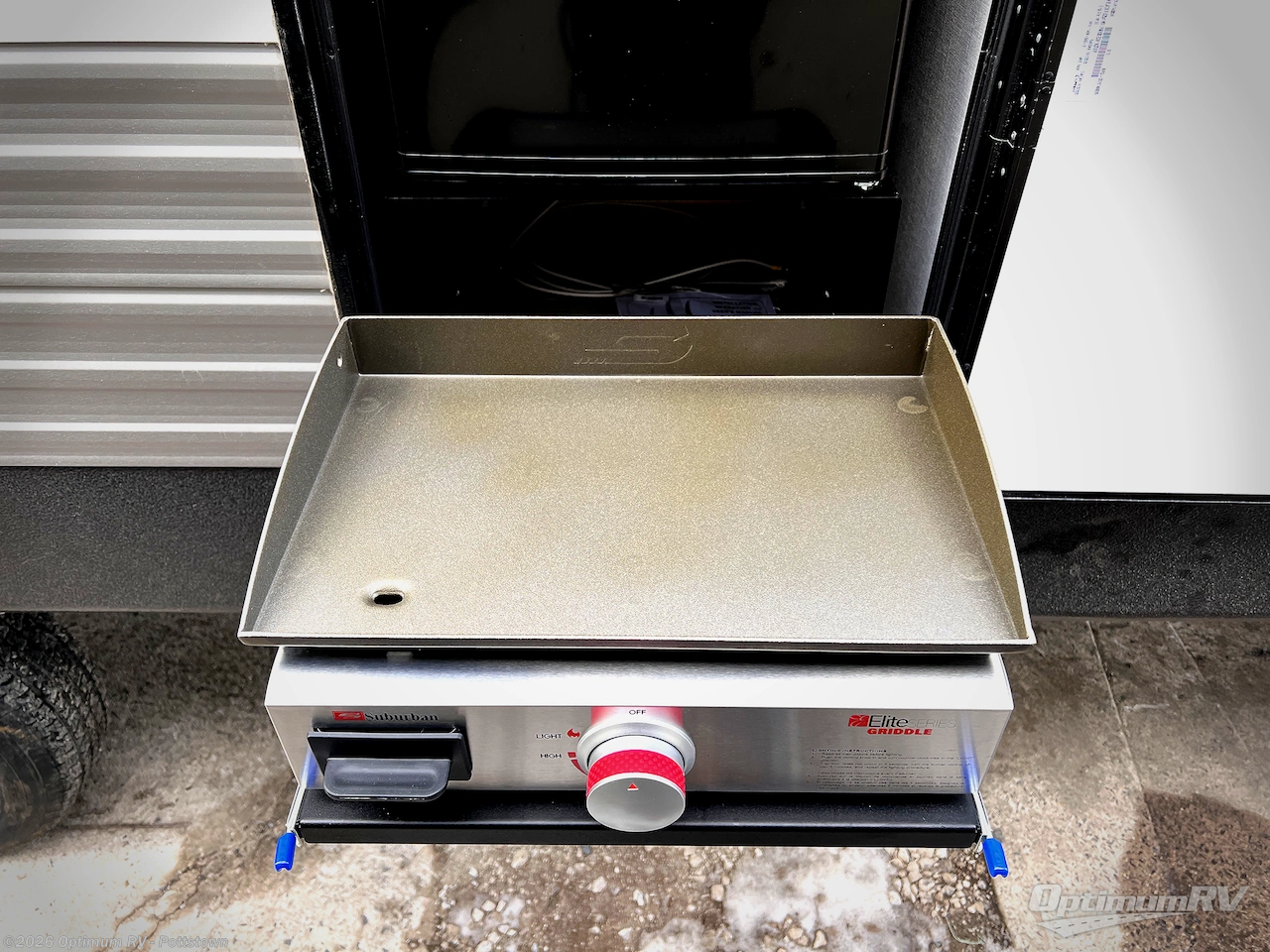 At the front of the trailer, a private bedroom welcomes you with a comfortable 60" x 80" queen bed for a restful night’s sleep, along with wardrobes on each side and an overhead shelf for organized storage. A convenient entry door provides direct access to this cozy space. Moving through the pass-through full bathroom, you’ll find storage beneath the countertop for toiletries and a 32" x 32" shower with a glass door, perfect for unwinding after a full day of adventure. At the center of the trailer, the main living area and kitchen create a spacious and functional hub, featuring a sofa and U-shaped dinette housed in a slide-out for plenty of seating space, while the fully equipped kitchen includes a sink with drying rack, a three-burner cooktop, and a 10 cu. ft. refrigerator so you can cook like a chef. Next to the second entry door, a walk-in pantry offers abundant space for dry goods and supplies. At the rear, two private bunk rooms each include a 38" x 72" bunk, dedicated storage, and a flip-up desk, ideal for work, study, or quiet time.