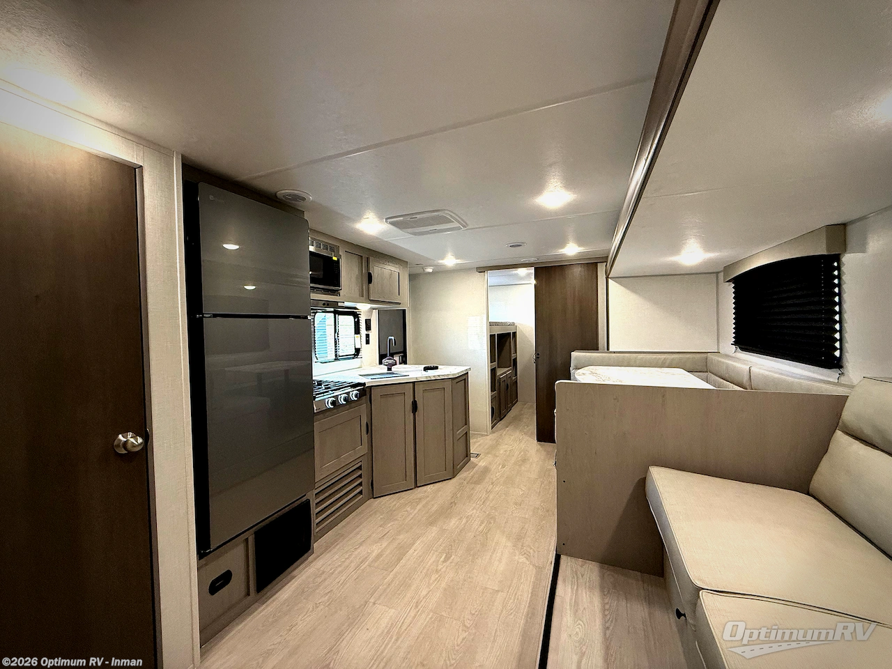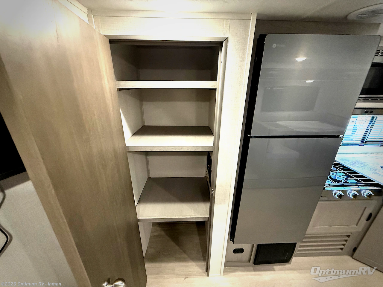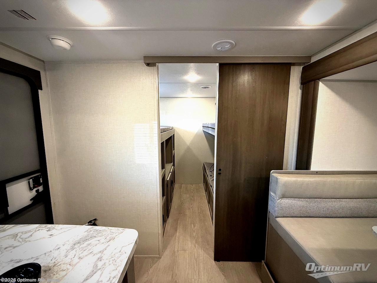 Everything you've been looking for in a travel trailer is found with this unit! The 21' power awning can be set up when you get to the campground, then you can unload the pass-thru storage and place some chairs under the awning. Once inside, you can put your things away in the front master bedroom that includes an RV queen bed and dual bedside wardrobes, plus you'll have a private entrance into the dual entry bath. The bath also includes one of the dual entry doors to the unit to make it easier to use when you're spending time outdoors. In the combined kitchen and living area you'll find a large slide out, a U-shaped dinette and sofa, plus a pantry with washer and dryer prep if you plan to go full-time. Another great feature on this travel trailer is the rear private bunkhouse! There are two 28" x 72" bunk beds on one side and across we have two 38" x 72" bunks, providing ample space for the whole gang to join the trip and have a place to rest.