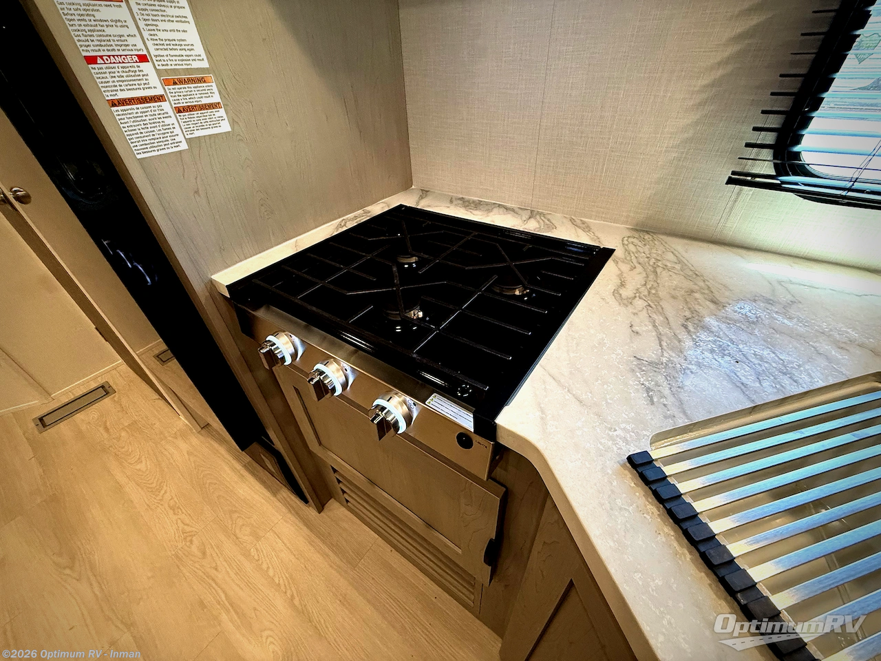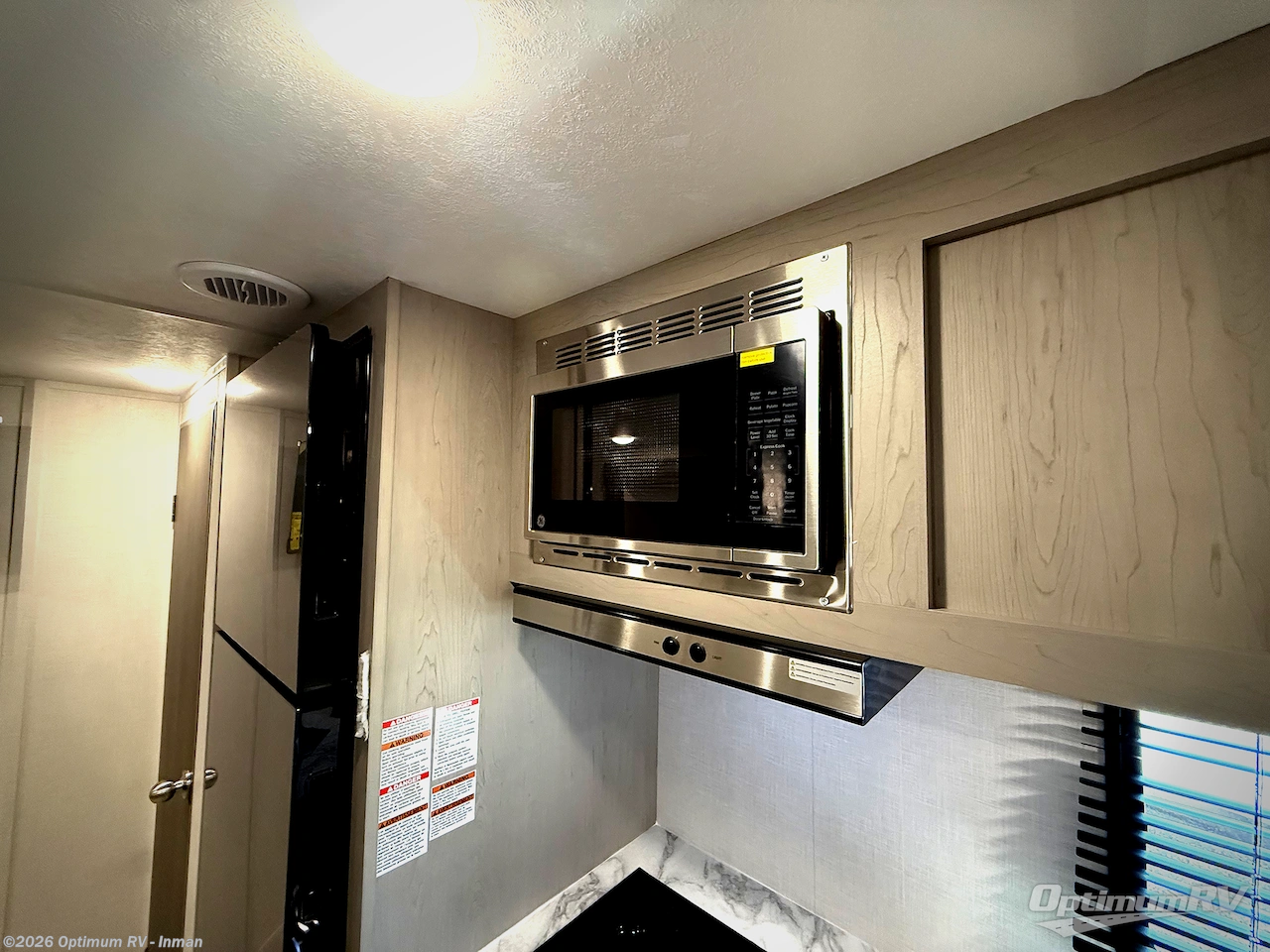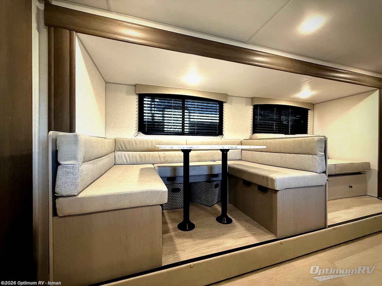 Everything you've been looking for in a travel trailer is found with this unit! The 21' power awning can be set up when you get to the campground, then you can unload the pass-thru storage and place some chairs under the awning. Once inside, you can put your things away in the front master bedroom that includes an RV queen bed and dual bedside wardrobes, plus you'll have a private entrance into the dual entry bath. The bath also includes one of the dual entry doors to the unit to make it easier to use when you're spending time outdoors. In the combined kitchen and living area you'll find a large slide out, a U-shaped dinette and sofa, plus a pantry with washer and dryer prep if you plan to go full-time. Another great feature on this travel trailer is the rear private bunkhouse! There are two 28" x 72" bunk beds on one side and across we have two 38" x 72" bunks, providing ample space for the whole gang to join the trip and have a place to rest.