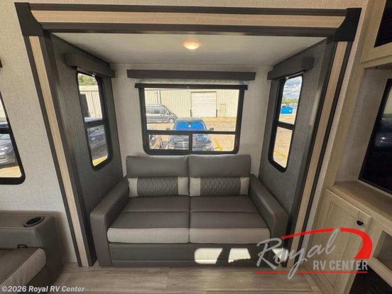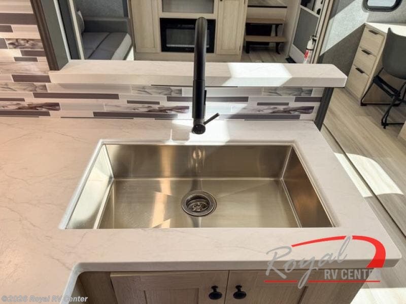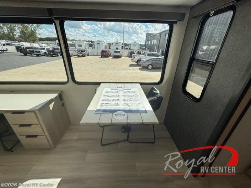 For the couple who love to cook, this fifth wheel is the perfect choice! There is generous counter space in the rear kitchen, along with overhead cabinetry, and a hi-top table and chairs for dining space. Beside the table is a desk with a chair and oversized opening windows so you can still enjoy nature views if you have to work. When it's time to relax, the tri-fold sofa and theater seating in the living room will do the trick, or you can head outdoors to enjoy the two power awnings. A full bath will let you freshen up before bed, and speaking of bedtime, the king bed slide out in the front bedroom is sure to bring comfort. There is also a walk-in wardrobe with washer and dryer prep and a dresser to keep your space tidy!