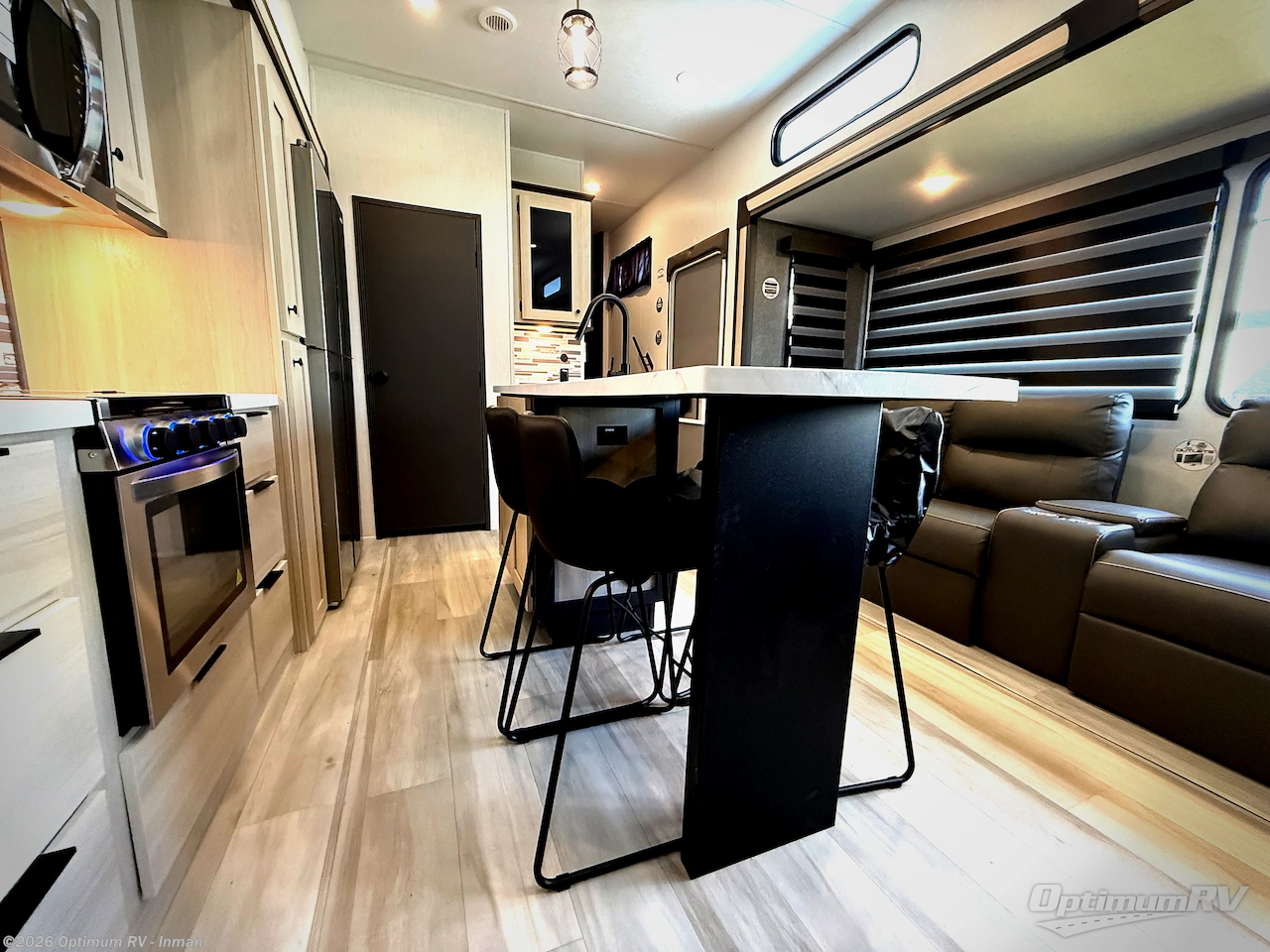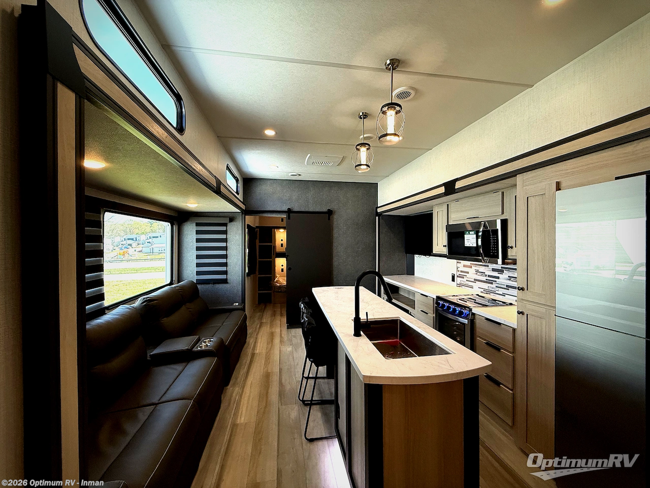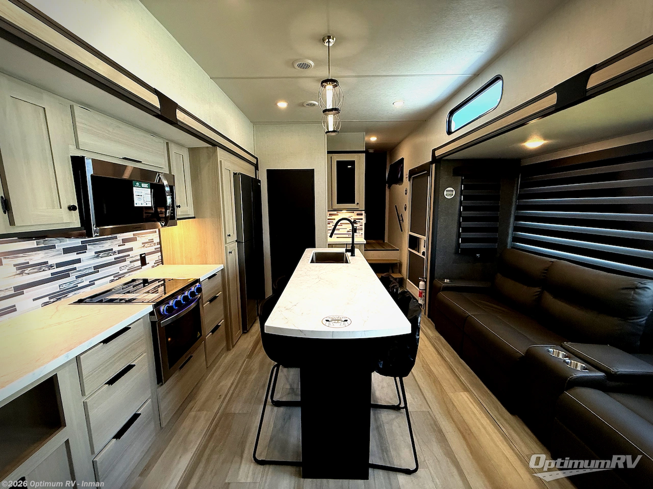 This thoughtfully designed fifth wheel that effortlessly balances privacy, functionality, and social comfort. At the rear we have a bunk house featuring a spacious 54x74-inch bed, accompanied by an upper bunk and a loft, perfect for kids, guests, or a private reading nook. A desk offers a dedicated workspace, while the full bathroom ensures comfort without sacrificing convenience. Moving forward, you'll find dual opposing slides that open up to create a large living area featuring a super sofa, ideal for gathering, dining, or catching up on entertainment. Here, a kitchen island provides a chef-centric workspace and the chairs around the island give a place to dine, along with two pantries to keep everything in reach. Toward the front, a serene queen-size bedroom awaits, offering a luxurious retreat with a large walk-in closet and dresser providing abundant storage for clothes and essentials.