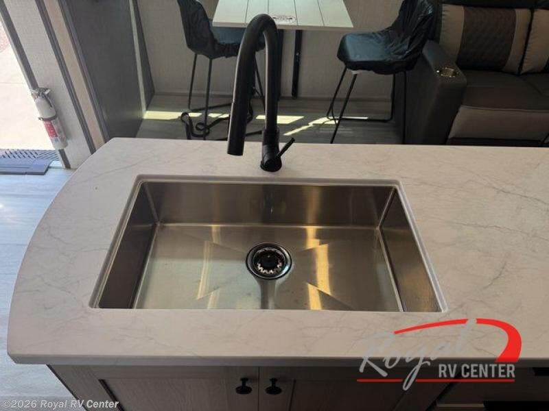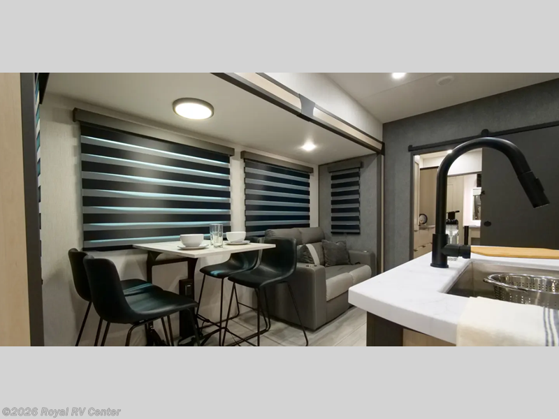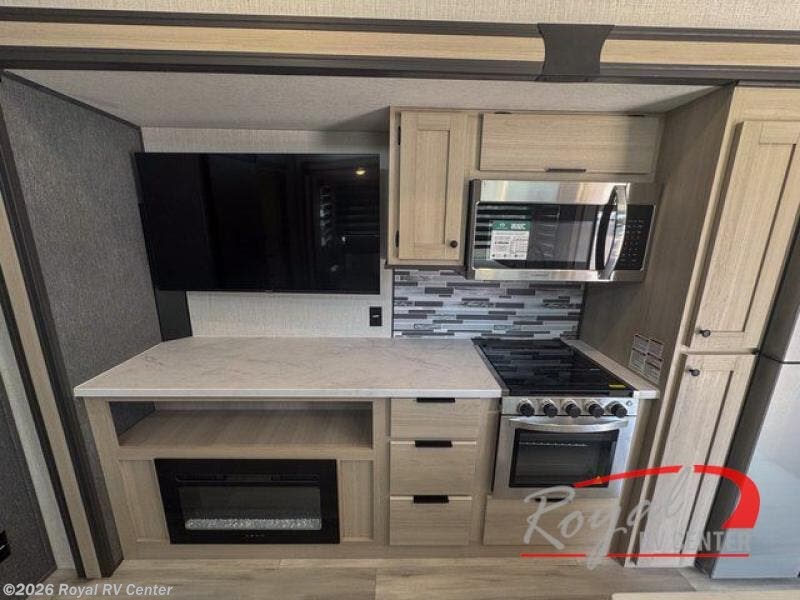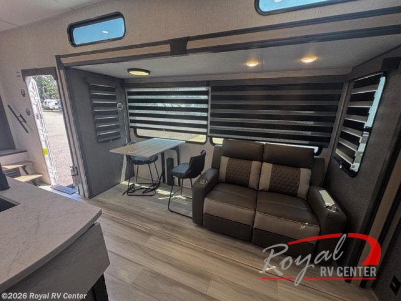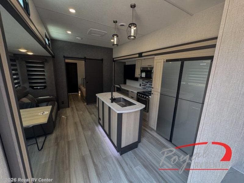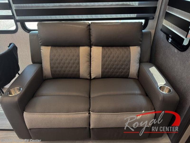 If you're ready for fun, look for further than this dual entry fifth wheel! It will be so easy to travel with friends and family since there is a master bedroom with a king bed and a full rear bath, plus a front bunkhouse suite with bunk beds, a queen bed, and a second full bath! The chef of your crew can whip up breakfast in the morning on the 21" 2-in-1 oven range or in the over-the-range microwave. There is also a 16 cu. ft. 12V refrigerator and walk-in pantry for food storage! The theater seating and table with chairs sit across from the entertainment center and fireplace for easy viewing in the evening, or you may just find yourselves outdoors visiting with campground neighbors!