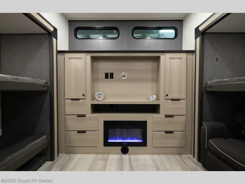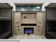 This fifth wheel's name describes it perfectly; it's the best! Your guests will love the rear private bunkhouse with dual opposing slides, bunk beds, plus a hide-a-bed sofa and an entertainment center with dual wardrobes. There is even a half bath with its own exterior entry door! You will have the front private bedroom all to yourselves with a king bed slide out and a walk-in wardrobe with washer and dryer prep. And the full bath is close by for easy nighttime use. The combined middle kitchen and living room will be a space everyone can meet in since there is a hi-top table and chairs and theater seating, an entertainment center with a fireplace, plus a kitchen island where snacks can be set out.
