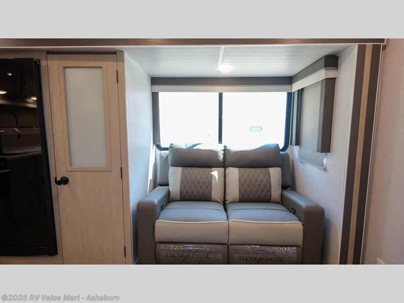 You're going to love cooking in the rear kitchen of this travel trailer! It has everything you need to prepare delicious home cooked meals including a large pantry and oversized fridge, plus there are two bar stools to sit on while you enjoy them. The theater seating is conveniently across from the swiveling entertainment center which has hidden shelves behind it for your games and movies. As you walk-through the bathroom, you will notice a walk-in shower to the left and a toilet and sink to the right. It leads directly into the front private bedroom which has a Versa-Tilt custom king bed to lay your head on at night and wardrobes/nightstands on either side for your items!