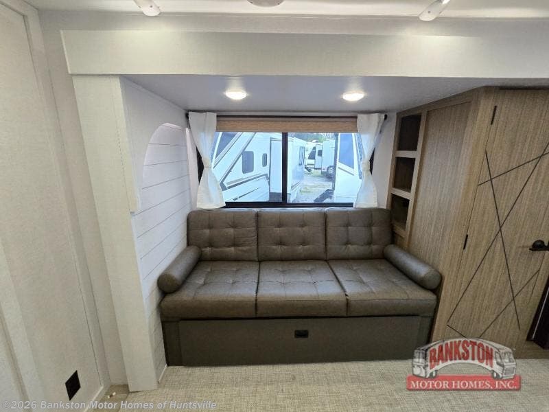 You can enjoy at-home comforts wherever you decide to camp in this travel trailer. The custom king bed with Versa Tilt includes dual shelves and a wardrobe so you can keep your space tidy. If you have a guest or two little ones, they can sleep on the jackknife sofa within the large slide out or on the double-size bunks right next to the full bath. Once you've made breakfast in the fully equipped kitchen, you can utilize the pull-out table to dine at. There is also a fireplace below the table, which will be perfect for cozy evenings indoors.