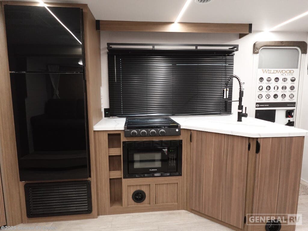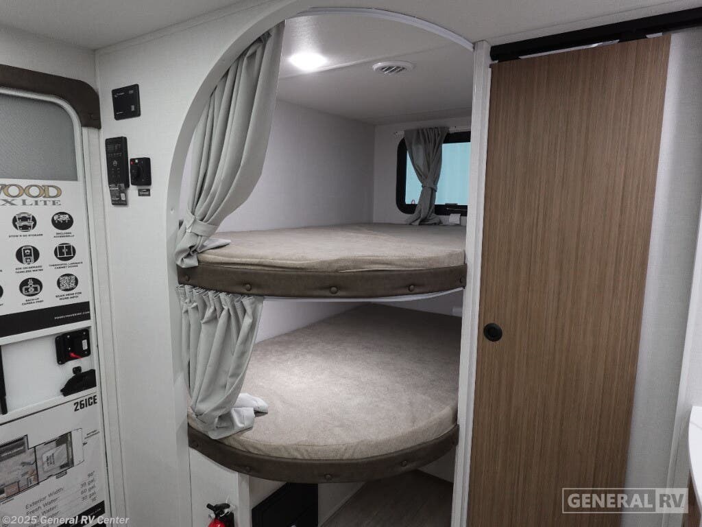 ## Forest River Wildwood X-Lite travel trailer 26ICE highlights - Front Private Bedroom - Large Slide Out - Pull-Out Drawers - 16' Power Awning - Fireplace - Pass-Through Storage You're sure to make camping memories in this spacious travel trailer! You can easily sleep eight people each night thanks to the double-size bunks, the custom king bed with Versa Tilt in the front bedroom plus the Versa-Lounge within the large slide out! The three burner cooktop and microwave oven will let you make meals each day, and you'll appreciate the hidden pantry with shelves behind the fireplace. There is also a booth dinette where you can dine together or play a game of cards after dinner is cleaned up, or you may just find yourselves outdoors under the 16' power awning with LED lights. And don't overlook the full bath, complete with a tub/shower that will make bath time easier if you have little ones. The Forest River Wildwood X-Lite travel trailers are comfortable enough to make any destination feel like home! The Wildwood X-Lite has a Dicor PVC roof membrane, a powder-coated I-beam frame, nitrogen-filled tires, and a cambered chassis as the base for all of its luxurious additions. Within the reliable construction, you will find excellent interior amenities, like the upgraded high-rise spring kitchen faucet, a huge kitchen window, a Bluetooth stereo, and upgraded designer furniture. The Wildwood X-Lite also comes with a pass-through storage compartment for your gear, an upgraded shower head, and a new 60K tankless water heater so you can have hot water when you need it!