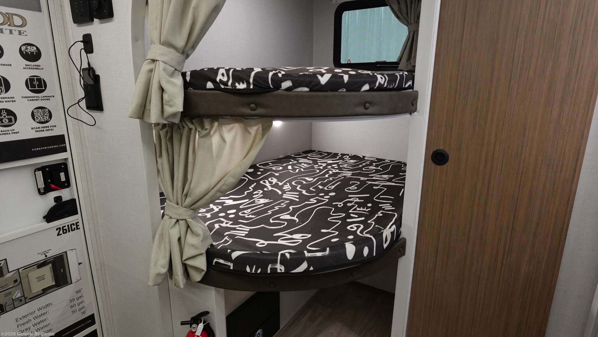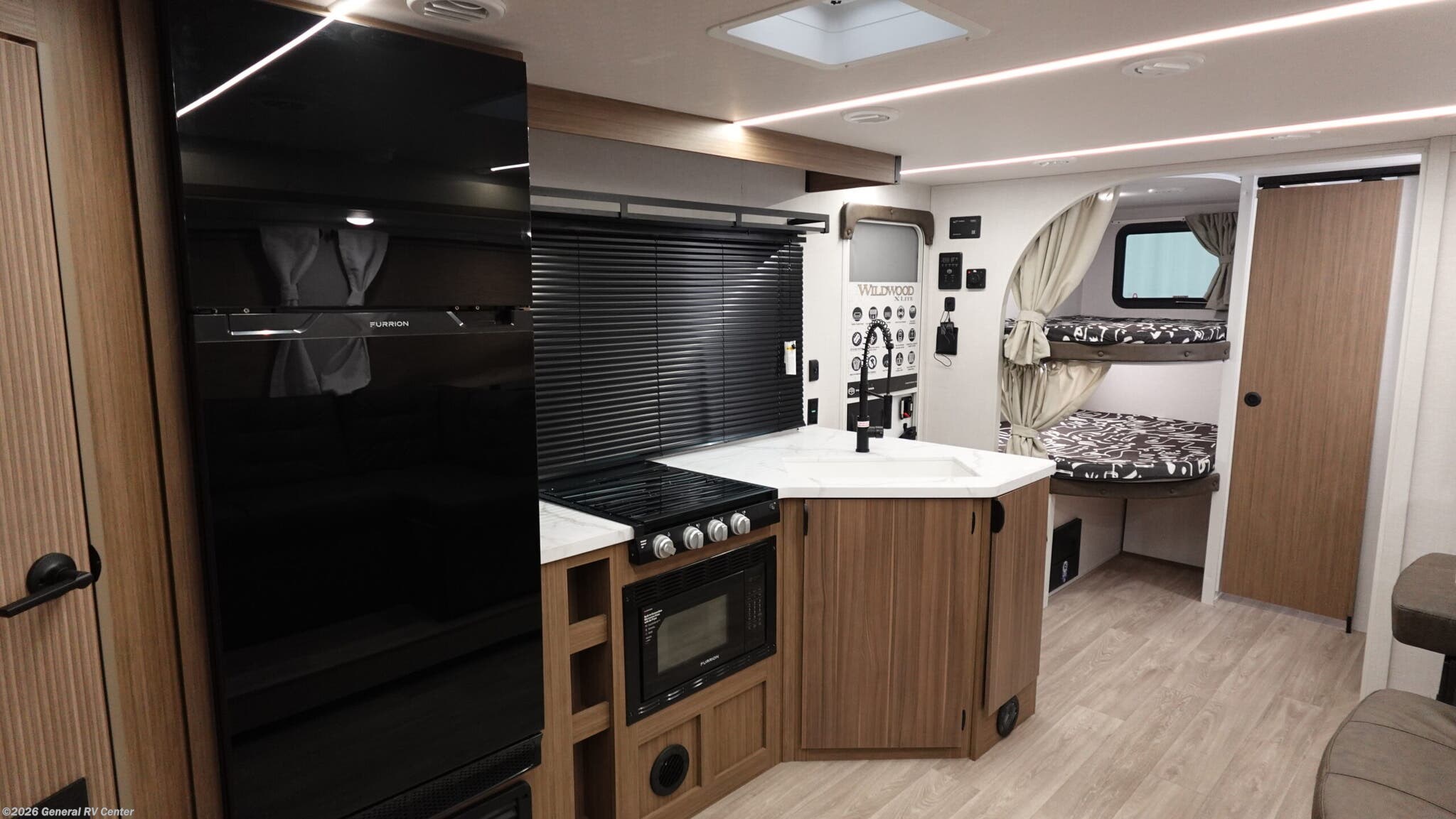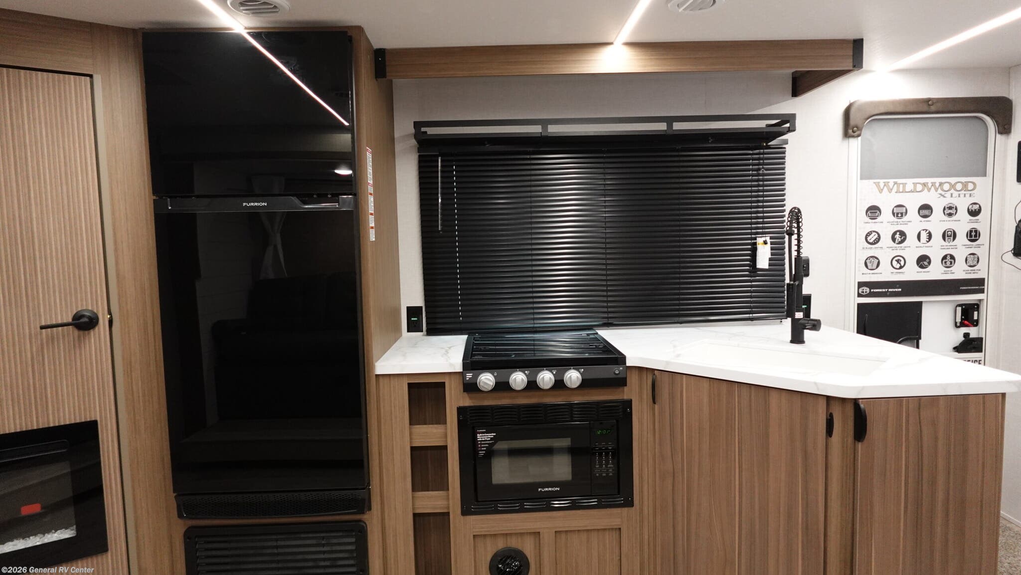 Experience the ultimate in family-friendly travel with the 2026 Forest River Wildwood X-Lite 26ICE. This RV seamlessly blends comfort and functionality, offering ample space for up to ten guests. The front bedroom features a versatile king bed, while the rear provides double-over-double bunks, ensuring everyone has a cozy spot to rest. The center kitchen and living area are designed for both convenience and relaxation, with a full-size electric refrigerator and a three-burner cooktop, making meal prep a breeze. The inviting Versa-Lounge offers a perfect spot to unwind, complete with a charming fireplace to enhance your evenings. The Wildwood X-Lite isn’t just about indoor comfort. Its 16 ft. powered retractable awning creates an ideal outdoor living space, perfect for enjoying nature without sacrificing shade or comfort. The rear bath, complete with a curtain shower, offers practicality and privacy. With a generous cargo capacity and ample storage options, including a hidden pantry and pass-thru storage, this RV ensures you have everything you need for your adventures. Whether you're exploring the open road or setting up camp, this RV is your perfect home away from home. For more details, visit your nearest General RV Dealership Location.