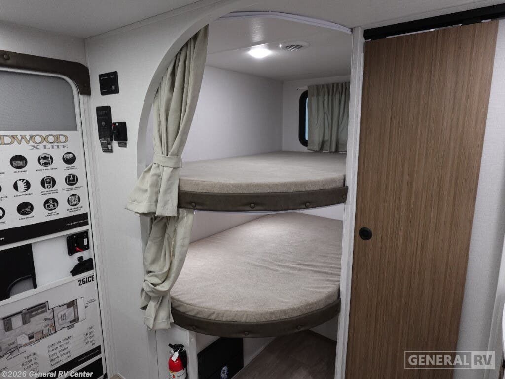 Experience the ultimate in family-friendly travel with the 2026 Forest River Wildwood X-Lite 26ICE. This RV seamlessly blends comfort and functionality, offering ample space for up to ten guests. The front bedroom features a versatile king bed, while the rear provides double-over-double bunks, ensuring everyone has a cozy spot to rest. The center kitchen and living area are designed for both convenience and relaxation, with a full-size electric refrigerator and a three-burner cooktop, making meal prep a breeze. The inviting Versa-Lounge offers a perfect spot to unwind, complete with a charming fireplace to enhance your evenings. The Wildwood X-Lite isn’t just about indoor comfort. Its 16 ft. powered retractable awning creates an ideal outdoor living space, perfect for enjoying nature without sacrificing shade or comfort. The rear bath, complete with a curtain shower, offers practicality and privacy. With a generous cargo capacity and ample storage options, including a hidden pantry and pass-thru storage, this RV ensures you have everything you need for your adventures. Whether you're exploring the open road or setting up camp, this RV is your perfect home away from home. For more details, visit your nearest General RV Dealership Location.