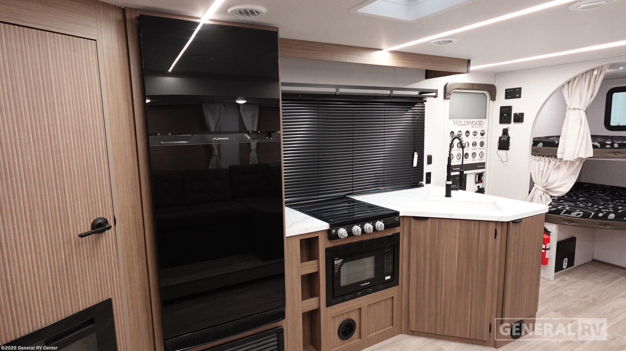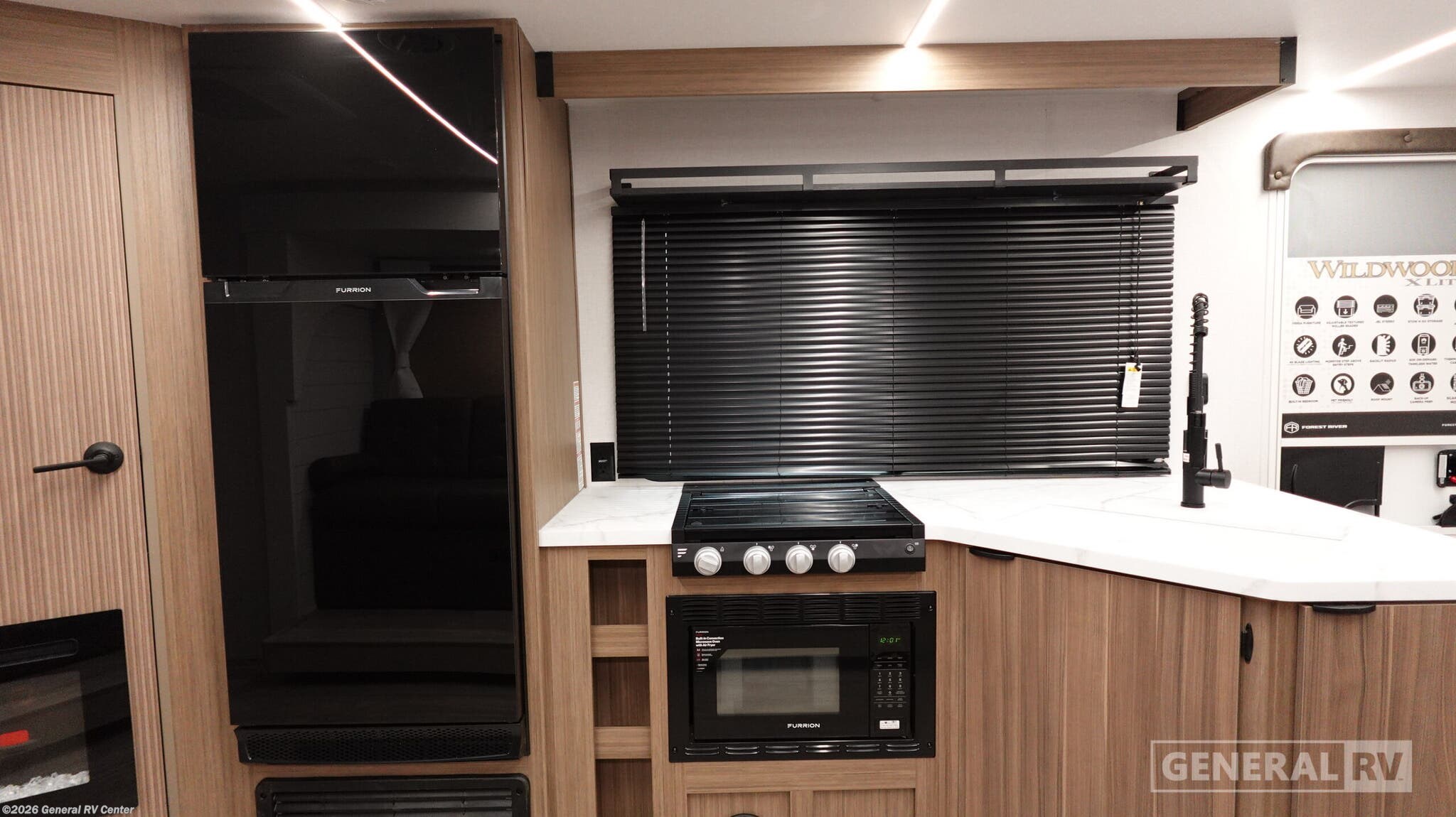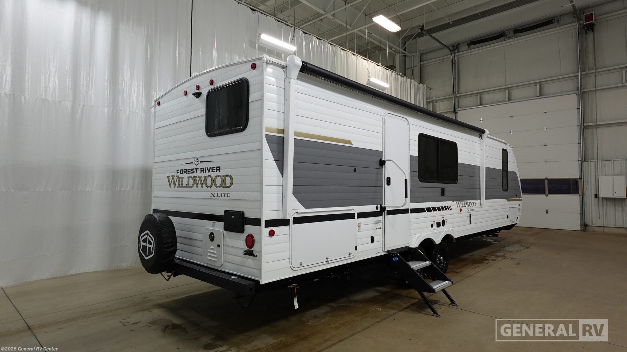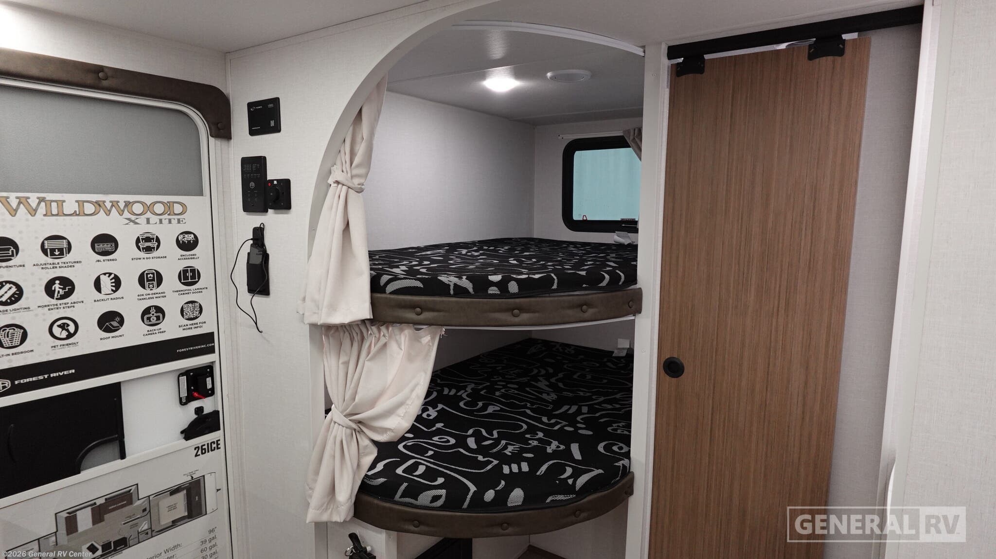 Experience the ultimate in family-friendly travel with the 2026 Forest River Wildwood X-Lite 26ICE. This RV seamlessly blends comfort and functionality, offering ample space for up to ten guests. The front bedroom features a versatile king bed, while the rear provides double-over-double bunks, ensuring everyone has a cozy spot to rest. The center kitchen and living area are designed for both convenience and relaxation, with a full-size electric refrigerator and a three-burner cooktop, making meal prep a breeze. The inviting Versa-Lounge offers a perfect spot to unwind, complete with a charming fireplace to enhance your evenings. The Wildwood X-Lite isn’t just about indoor comfort. Its 16 ft. powered retractable awning creates an ideal outdoor living space, perfect for enjoying nature without sacrificing shade or comfort. The rear bath, complete with a curtain shower, offers practicality and privacy. With a generous cargo capacity and ample storage options, including a hidden pantry and pass-thru storage, this RV ensures you have everything you need for your adventures. Whether you're exploring the open road or setting up camp, this RV is your perfect home away from home. For more details, visit your nearest General RV Dealership Location.