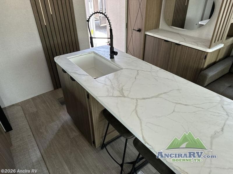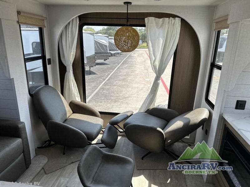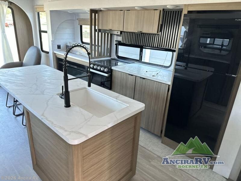 Find your zen int this spacious travel trailer for four! Once you've unloaded your gear, you can head inside to make lunch at the kitchen island with four chairs. An 80" trundle sofa provides additional seating space plus sleeping space for guests. You will love the rear custom recliners that are conveniently located next to the fireplace. The full bath is located towards the front next to the private bedroom so you can easily use the restroom at night, and you're sure to get a great night's rest on the custom king bed with Versa Tilt. This unit also includes washer and dryer prep, giving you the option to add these appliances.