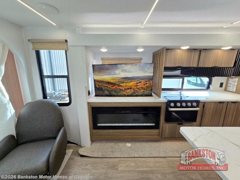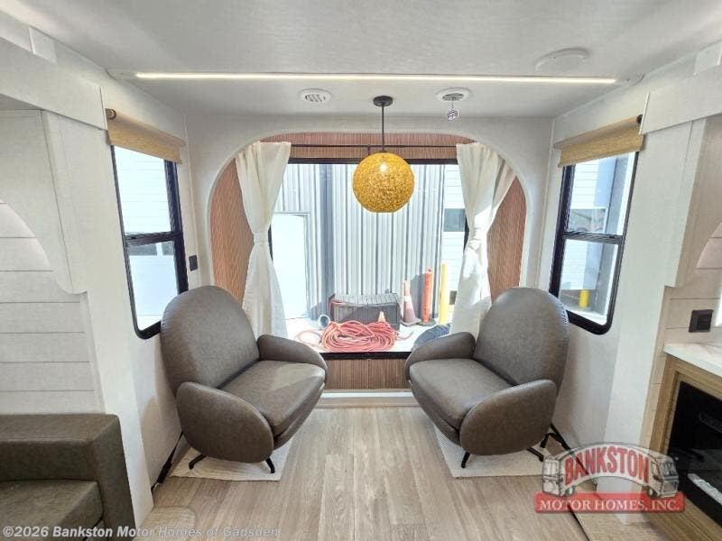 Find your zen int this spacious travel trailer for four! Once you've unloaded your gear, you can head inside to make lunch at the kitchen island with four chairs. An 80" trundle sofa provides additional seating space plus sleeping space for guests. You will love the rear custom recliners that are conveniently located next to the fireplace. The full bath is located towards the front next to the private bedroom so you can easily use the restroom at night, and you're sure to get a great night's rest on the custom king bed with Versa Tilt. This unit also includes washer and dryer prep, giving you the option to add these appliances.