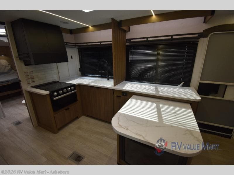 Everyone will enjoy having their own space in this travel trailer thanks to the front master bedroom and the rear bunkhouse. The bunkhouse includes a wall to separate the Versa bunk and fold-down desk on one side and a Versa sofa on the other, perfect for older kids or guests. You'll have the custom king bed with Versa Tilt all to yourselves, and the walk-thru bath will be easily accessible for everyone. In the combined kitchen and living room, a jackknife sofa slide sits across from the fireplace/entertainment center, and there is a pull-out table here so you can dine together.