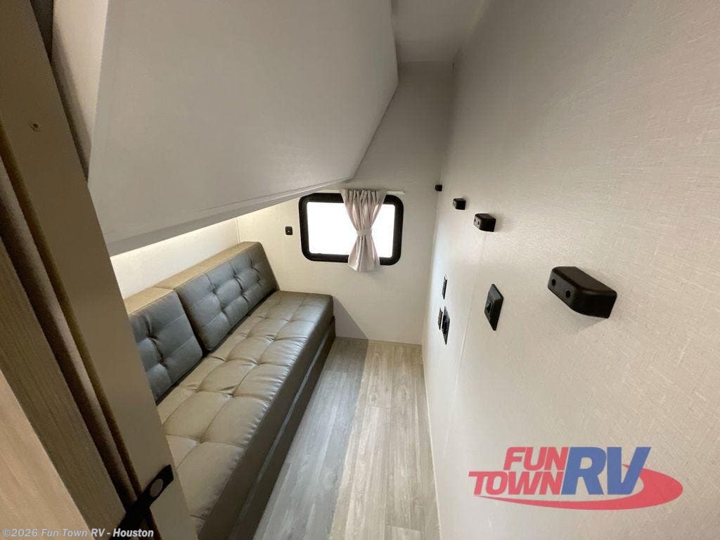 Everyone will enjoy having their own space in this travel trailer thanks to the front master bedroom and the rear bunkhouse. The bunkhouse includes a wall to separate the Versa bunk and fold-down desk on one side and a Versa sofa on the other, perfect for older kids or guests. You'll have the custom king bed with Versa Tilt all to yourselves, and the walk-thru bath will be easily accessible for everyone. In the combined kitchen and living room, a jackknife sofa slide sits across from the fireplace/entertainment center, and there is a pull-out table here so you can dine together.