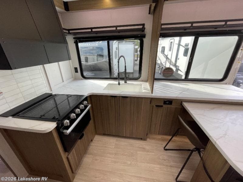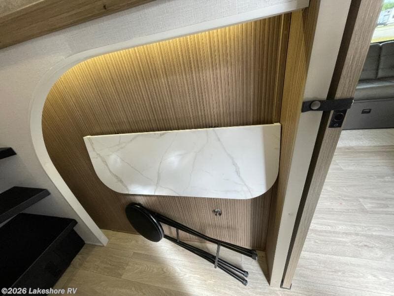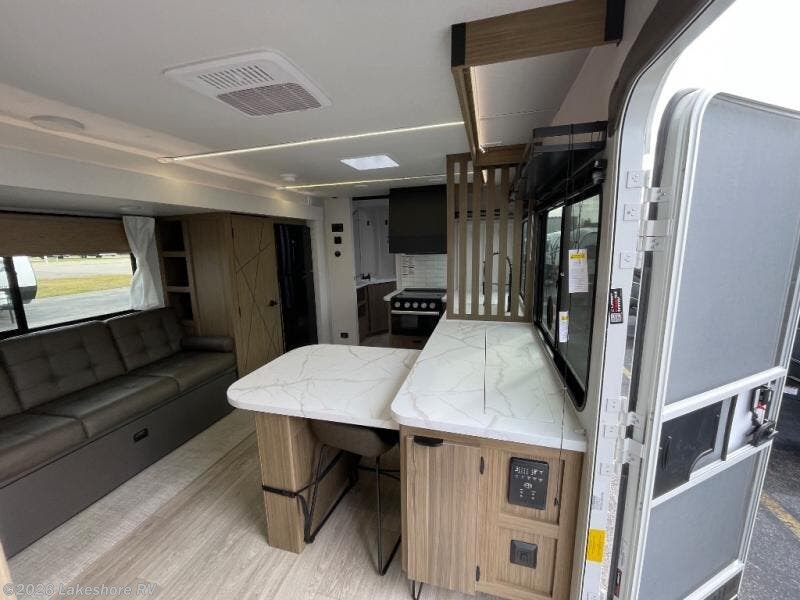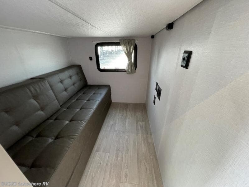 Everyone will enjoy having their own space in this travel trailer thanks to the front master bedroom and the rear bunkhouse. The bunkhouse includes a wall to separate the Versa bunk and fold-down desk on one side and a Versa sofa on the other, perfect for older kids or guests. You'll have the custom king bed with Versa Tilt all to yourselves, and the walk-thru bath will be easily accessible for everyone. In the combined kitchen and living room, a jackknife sofa slide sits across from the fireplace/entertainment center, and there is a pull-out table here so you can dine together.