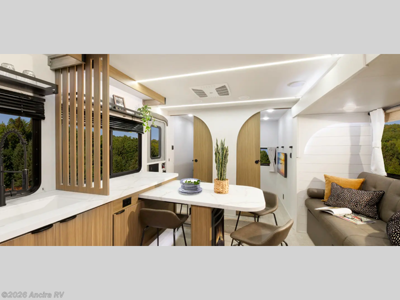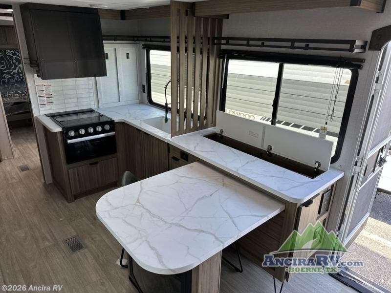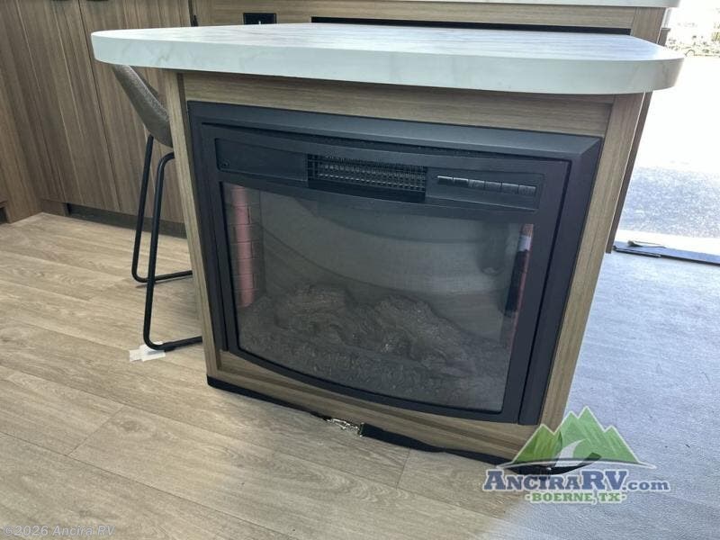 Everyone will enjoy having their own space in this travel trailer thanks to the front master bedroom and the rear bunkhouse. The bunkhouse includes a wall to separate the Versa bunk and fold-down desk on one side and a Versa sofa on the other, perfect for older kids or guests. You'll have the custom king bed with Versa Tilt all to yourselves, and the walk-thru bath will be easily accessible for everyone. In the combined kitchen and living room, a jackknife sofa slide sits across from the fireplace/entertainment center, and there is a pull-out table here so you can dine together.