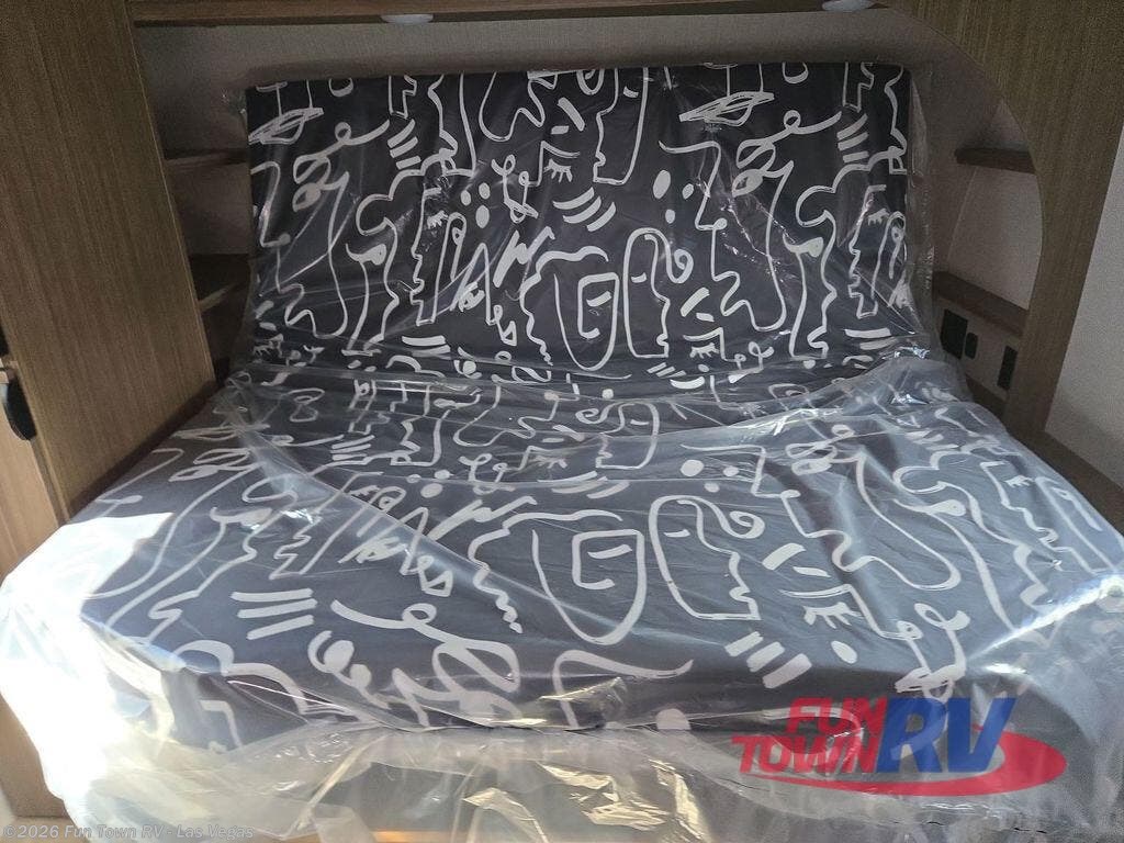 Everyone will enjoy having their own space in this travel trailer thanks to the front master bedroom and the rear bunkhouse. The bunkhouse includes a wall to separate the Versa bunk and fold-down desk on one side and a Versa sofa on the other, perfect for older kids or guests. You'll have the custom king bed with Versa Tilt all to yourselves, and the walk-thru bath will be easily accessible for everyone. In the combined kitchen and living room, a jackknife sofa slide sits across from the fireplace/entertainment center, and there is a pull-out table here so you can dine together.