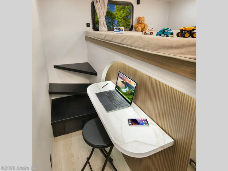Everyone will love camping in this spacious travel trailer with double-size bunks and a large slide out for more space. You'll have the custom king bed with Versa Tilt all to yourselves, and the walk-thru bath will be easily accessible for everyone. In the combined kitchen and living room, a sofa slide sits across from the fireplace/entertainment center, and there is a pull-out table here so you can dine together.