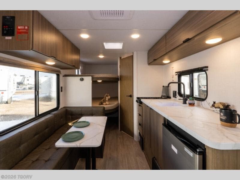 The double-size bunks with storage will be a big selling point in this travel trailer! While your guests take the bunks, you can have the front queen bed all to yourselves, and there is a wardrobe to keep your things organized. A two burner cooktop and microwave will let you make meals each day, and you can dine at the open lounge with a table.