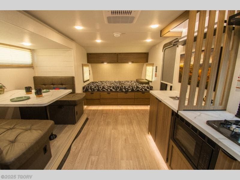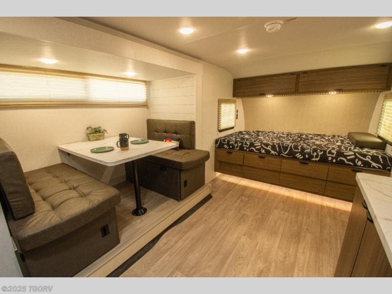 It will be so easy to enjoy time spent in this travel trailer for three. The front queen bed provides a great night's rest, and there is an overhead cabinet to keep your things organized. A two-burner cooktop in the kitchen will let you make meals for your crew, and a refrigerator keeps leftovers fresh. You can dine at the booth dinette within the slide out or take your plate outdoors to sit under the 12' power awning. And a full rear bath with a shower, toilet, and large vanity counter lets you stay clean each day!
