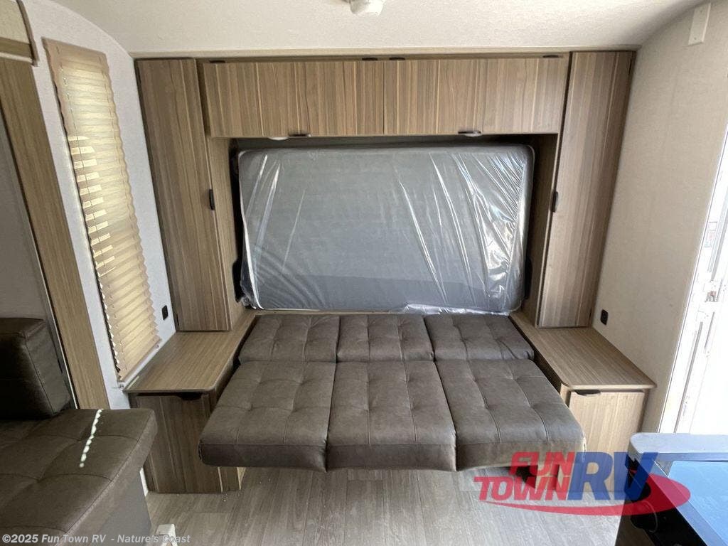 Bring your whole crew along for trips in this roomy travel trailer that can sleep eight people each night. Once you've set up the 14' power awning with LED lights, make lunch on the outside kitchen. Explore some trails or take your fishing poles down to the river, then head back to the trailer to clean up in the full bath. The kids may want to rest on the double-size bunks, while the adults play a game around the U-shaped dinette. This model also includes a sofa plus a Murphy bed that lowers over the sofa when you're ready for bed. Don't let this travel trailer slip away!