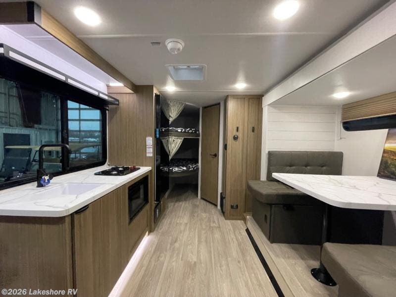 It will be so easy to enjoy time spent in this travel trailer for seven. The front queen bed provides a great night's rest, and there is an overhead cabinet to keep your things organized. Your guests or little ones can claim the double-size bunks for themselves, and there is a full bath adjacent to the bunks for easy nighttime use. A two-burner cooktop in the kitchen will let you make meals for your crew, and a refrigerator keeps leftovers fresh. You can dine at the booth dinette within the slide out or take your plate outdoors to sit under the 15' power awning.