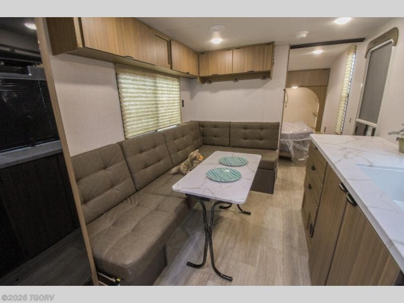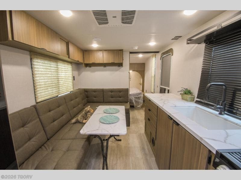 The main living area is built for gathering. A large super U-shaped dinette provides plenty of seating for meals, games, or relaxing, and it can convert into additional sleeping space when needed.
