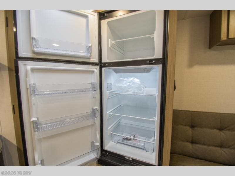 On the outside, you’ll appreciate features like the aerodynamic front profile, diamond plate rock guard, seamless holding tanks, and nitrogen-filled tires for a smoother ride. There’s even an exterior cable hookup so you can relax under the awning and enjoy your favorite shows at the campsite.