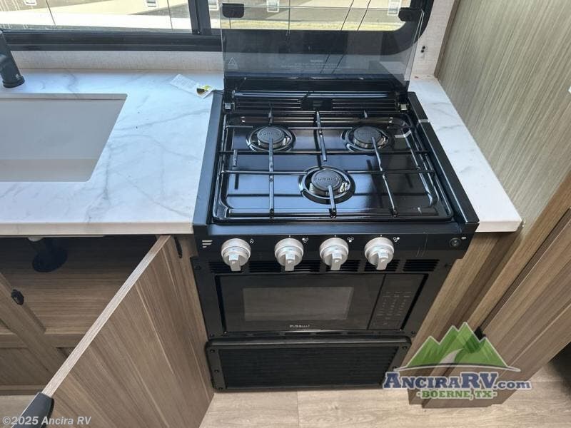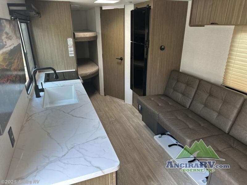 Camping is made easy in this travel trailer with more sleeping space and lots of comforts! The kids or your guests will enjoy the double-size bunks in the back, along with the full bath close by for easy nighttime use. You'll have the front private bedroom with a king bed all to yourselves, and there are dual bedroom wardrobes to keep your space neat and clean. Everyone can meet in the combined kitchen and living room to relax on the super U-lounge with a removable table while the chef of your group makes breakfast on the two burner cooktop. There is also a microwave oven for quick meals, plus a pantry and large under counter refrigerator for food storage!