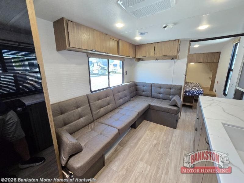 Camping is made easy in this travel trailer with more sleeping space and lots of comforts! The kids or your guests will enjoy the double-size bunks in the back, along with the full bath close by for easy nighttime use. You'll have the front private bedroom with a king bed all to yourselves, and there are dual bedroom wardrobes to keep your space neat and clean. Everyone can meet in the combined kitchen and living room to relax on the super U-lounge with a removable table while the chef of your group makes breakfast on the two-burner cooktop. There is also a microwave oven for quick meals, plus a pantry and large under counter refrigerator for food storage!
