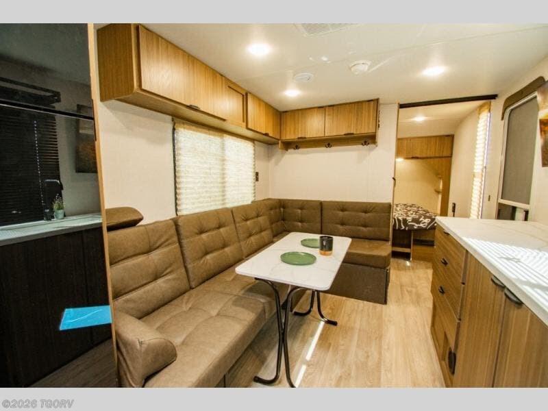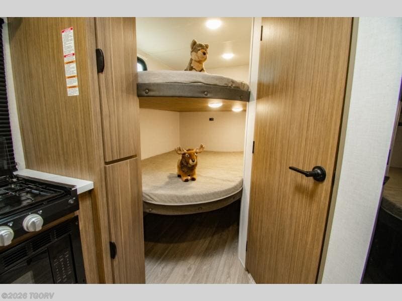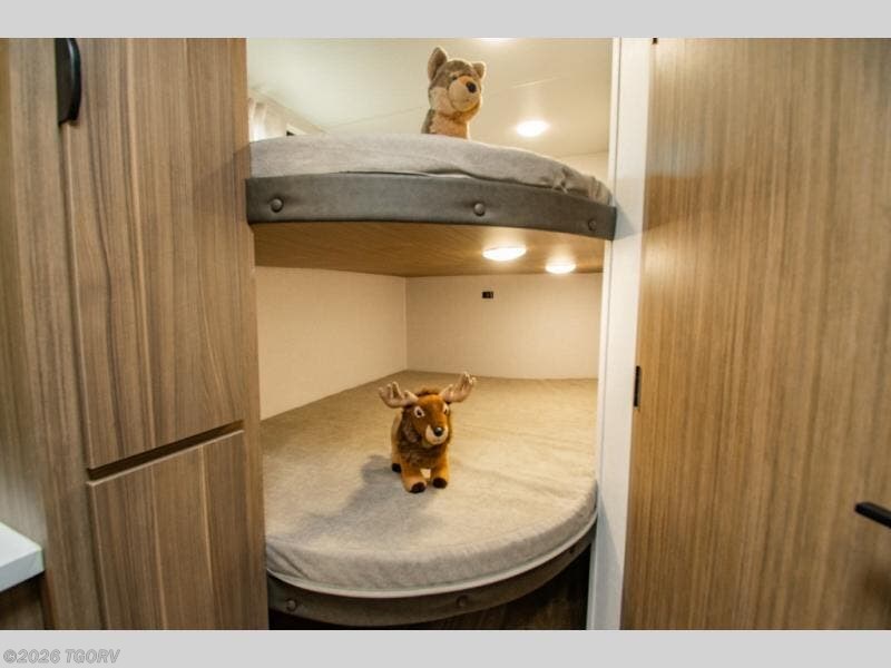 Camping is made easy in this travel trailer with more sleeping space and lots of comforts! The kids or your guests will enjoy the double-size bunks in the back, along with the full bath close by for easy nighttime use. You'll have the front private bedroom with a king bed all to yourselves, and there are dual bedroom wardrobes to keep your space neat and clean. Everyone can meet in the combined kitchen and living room to relax on the super U-lounge with a removable table while the chef of your group makes breakfast on the two-burner cooktop. There is also a microwave oven for quick meals, plus a pantry and large under counter refrigerator for food storage!