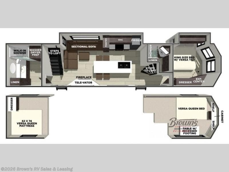 This thoughtfully designed 42ZEN model provides a blend of comfort and functionality. It features two lofts for added sleeping and living space, one includes a 62" x 74" Versa queen mattress and a dresser for storing clothes and essentials, while the second loft offers another Versa queen bed, plus a table with recessed footing, perfect for getting work or study done on the road. There is also a cabinet and shelf to keep everything organized. On the main floor, you'll find a large rear full bathroom, complete with a walk-in shower, linen closet, and washer/dryer prep, providing all the comforts of home. The main living area centers around a large sectional sofa with room for the whole crew, facing a fireplace and Televator TV, making it the perfect space to relax after a long day. The kitchen island also adds valuable prep space and also serves as a gathering spot with room for stools. Up front, the master bedroom features a king-size bed with Versa Tilt, a dresser, and its own private bathroom, offering convenience and privacy whenever you need it.