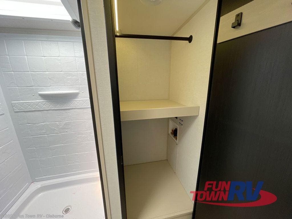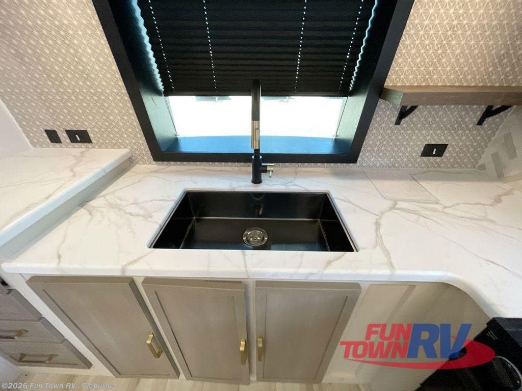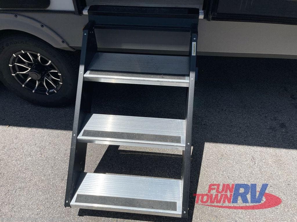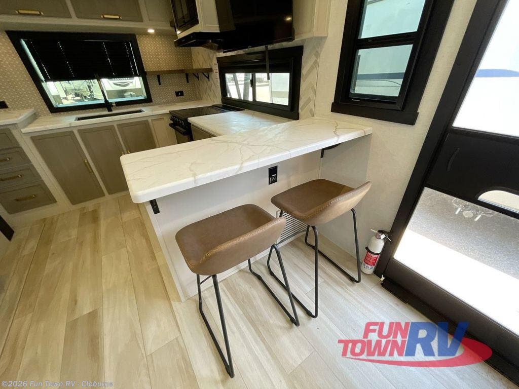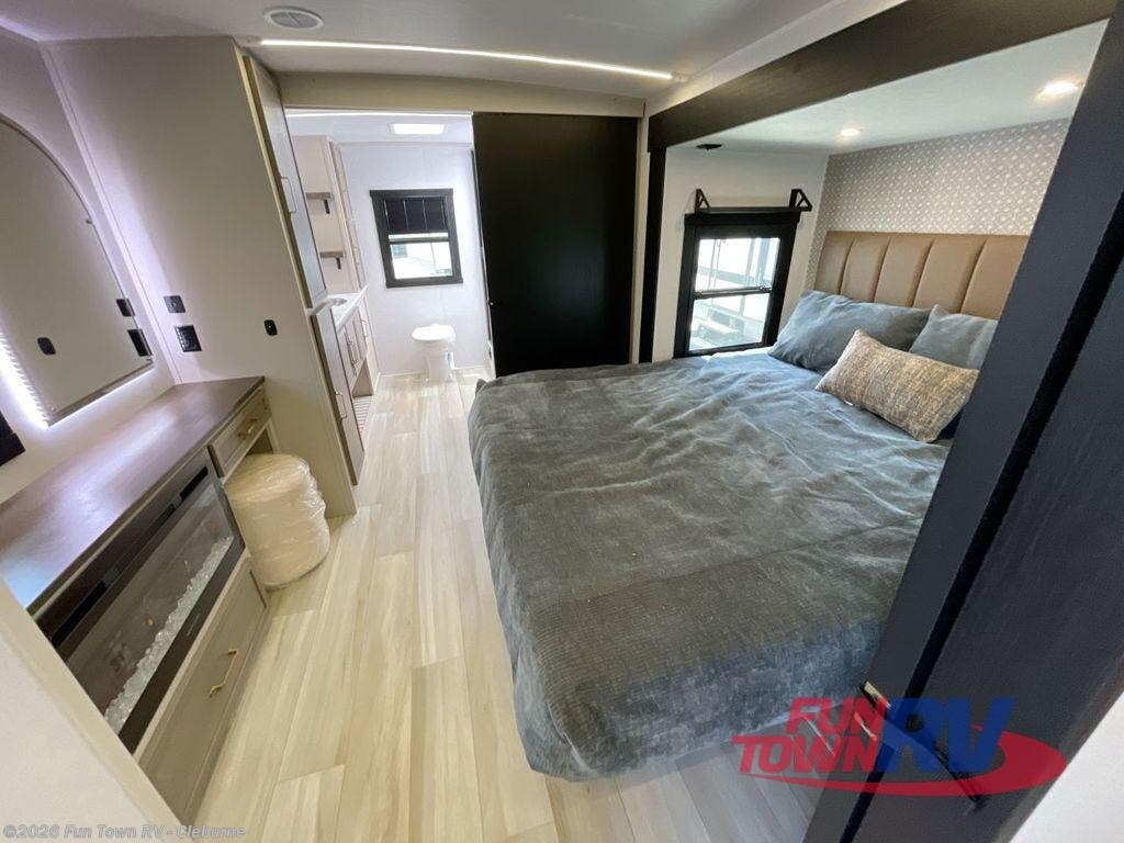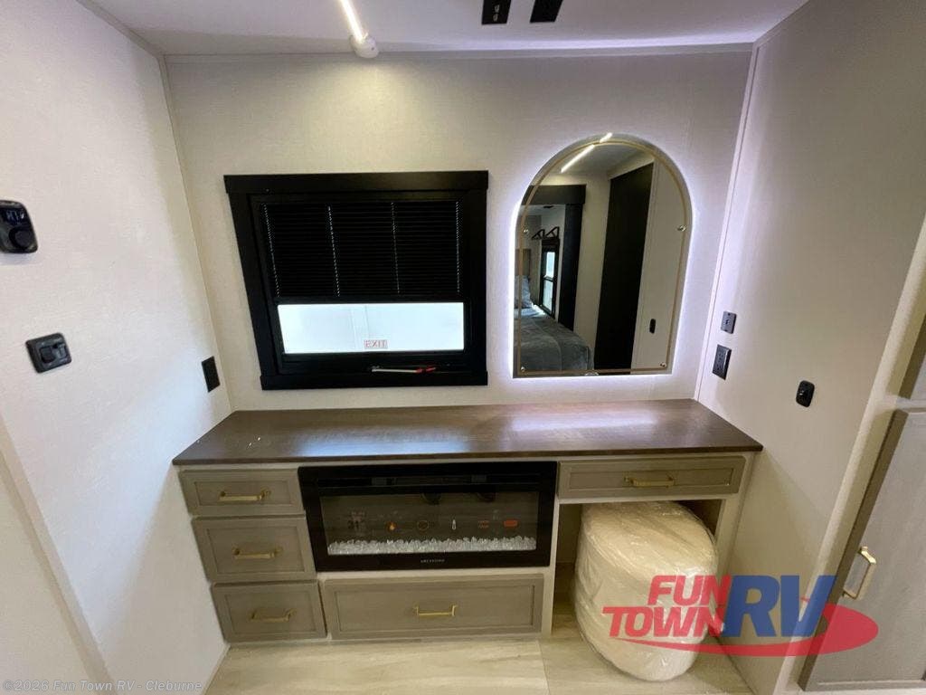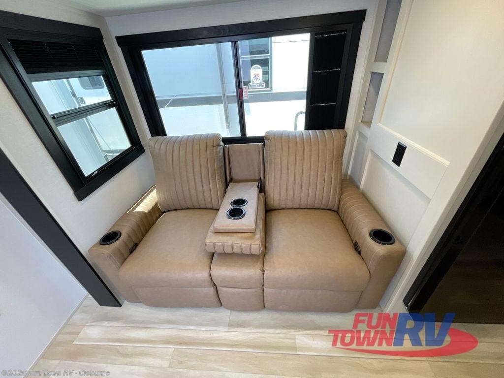 You'll love every minute spent in this double slide out, couple's trailer! You can wake up refreshed each day on your king bed, and enjoy great outdoor views with the bedroom panoramic window. There is also a dresser with a fireplace for a more cozy feel, and the full rear bath includes dual bath sinks plus a walk-in shower to freshen up in. Washer and dryer connections are also located here so you can choose to add those appliances if you wish. The main living area includes a 67" theater seat, no carpet for easy cleaning, and ample counter space in the front kitchen. There is also a bar top with two seats, and plenty of storage space for all your belongings.
