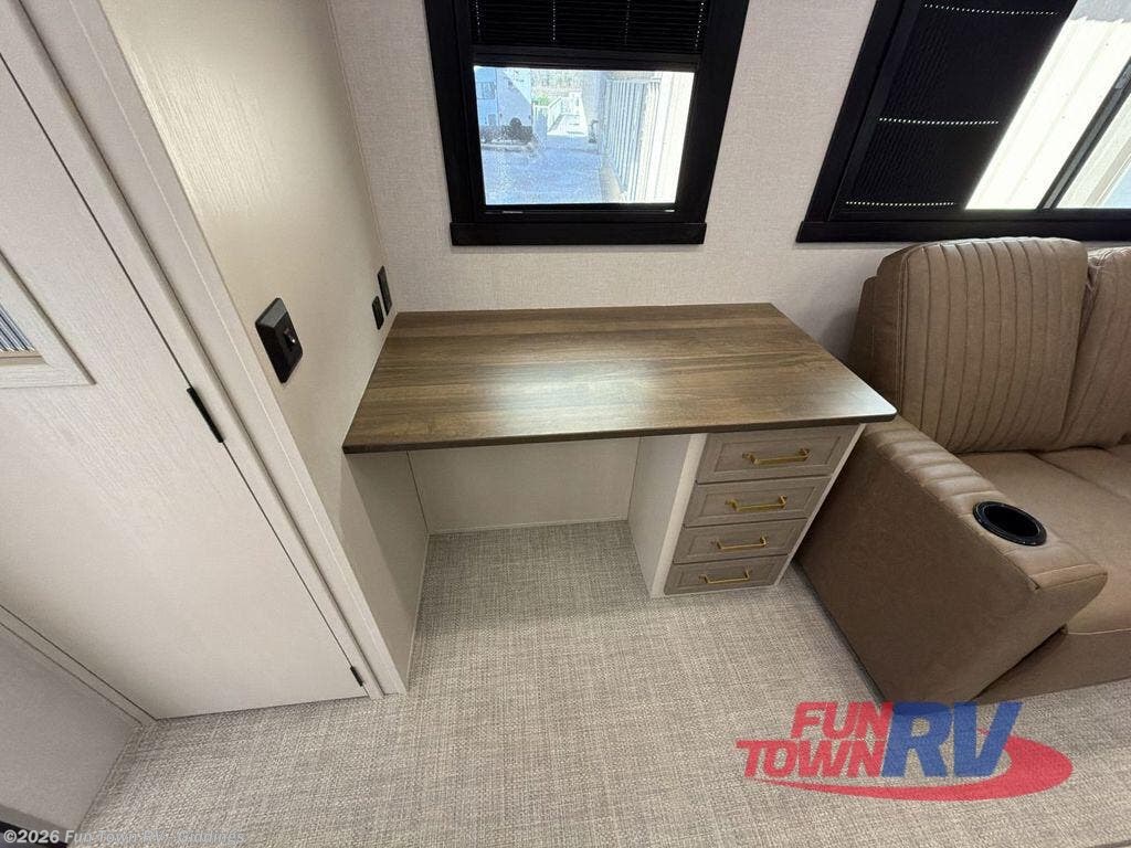 It won't be hard to find comfort in this spacious fifth wheel for four! Once you've unloaded the pass-thru storage, you can head inside to make lunch in the full kitchen. There is a 16-cu. ft. 12V refrigerator here to keep food fresh, and everyone can dine at the kitchen island with four chairs. The theater seating is directly across from the 50" TV and fireplace, and you'll appreciate the hidden storage behind the TV for movies, games, and books! A desk with a chair is also found in the combined kitchen and living area if you need to get some work done, and a rear tri-fold sofa provides sleeping space for guests. Don't overlook the spacious full bath with dual sinks and the front private bedroom with a custom king bed slide. A front wardrobe plus a dresser will let you keep your space tidy, and there is washer/dryer prep if you plan to add those appliances!