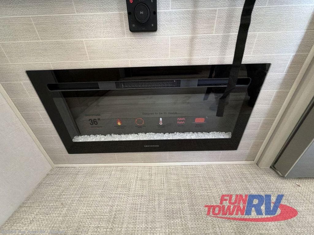 It won't be hard to find comfort in this spacious fifth wheel for four! Once you've unloaded the pass-thru storage, you can head inside to make lunch in the full kitchen. There is a 16-cu. ft. 12V refrigerator here to keep food fresh, and everyone can dine at the kitchen island with four chairs. The theater seating is directly across from the 50" TV and fireplace, and you'll appreciate the hidden storage behind the TV for movies, games, and books! A desk with a chair is also found in the combined kitchen and living area if you need to get some work done, and a rear tri-fold sofa provides sleeping space for guests. Don't overlook the spacious full bath with dual sinks and the front private bedroom with a custom king bed slide. A front wardrobe plus a dresser will let you keep your space tidy, and there is washer/dryer prep if you plan to add those appliances!