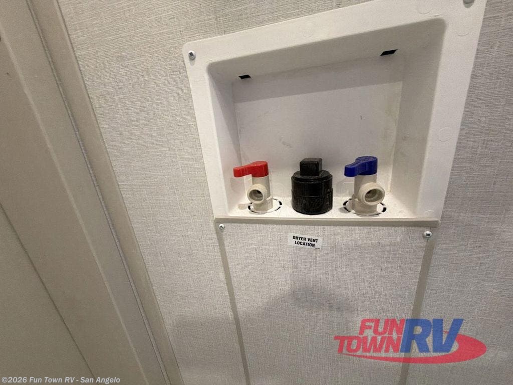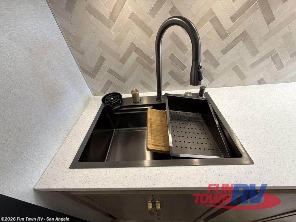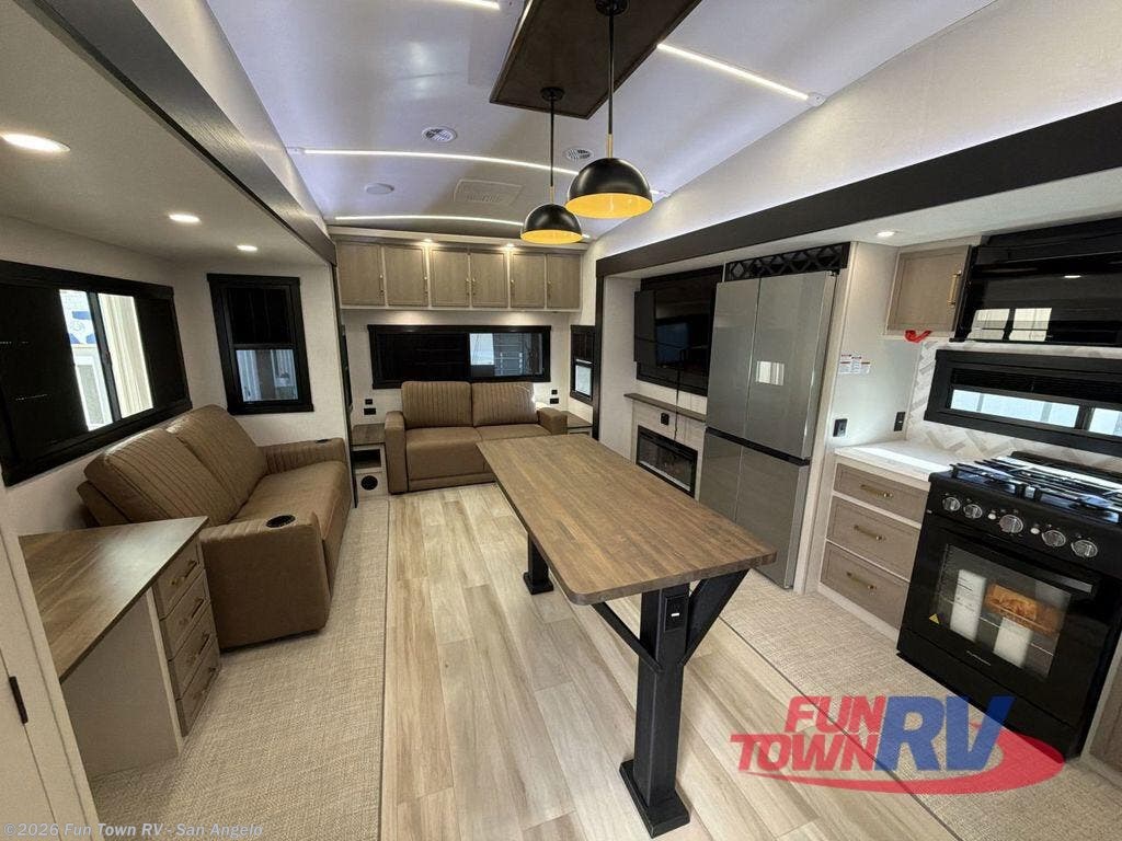 It won't be hard to find comfort in this spacious fifth wheel for four! Once you've unloaded the pass-thru storage, you can head inside to make lunch in the full kitchen. There is a 16-cu. ft. 12V refrigerator here to keep food fresh, and everyone can dine at the kitchen island with four chairs. The theater seating is directly across from the 50" TV and fireplace, and you'll appreciate the hidden storage behind the TV for movies, games, and books! A desk with a chair is also found in the combined kitchen and living area if you need to get some work done, and a rear tri-fold sofa provides sleeping space for guests. Don't overlook the spacious full bath with dual sinks and the front private bedroom with a custom king bed slide. A front wardrobe plus a dresser will let you keep your space tidy, and there is washer/dryer prep if you plan to add those appliances!