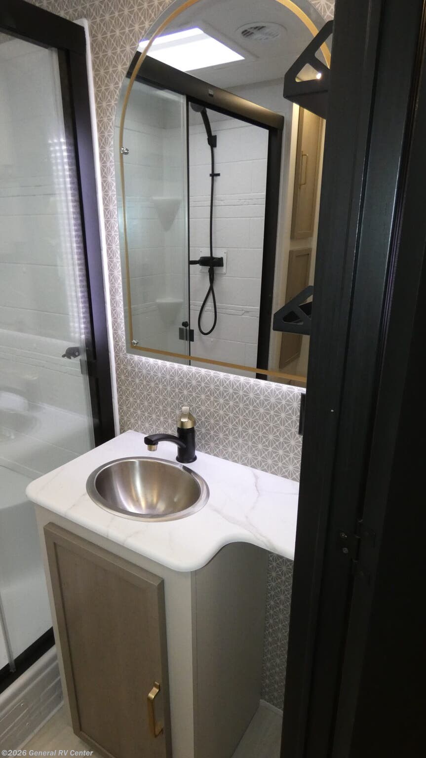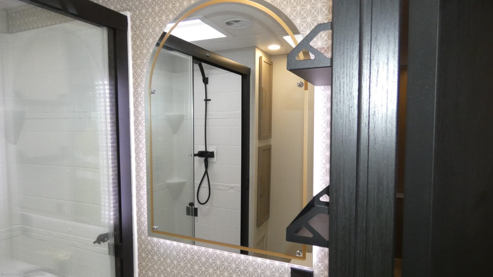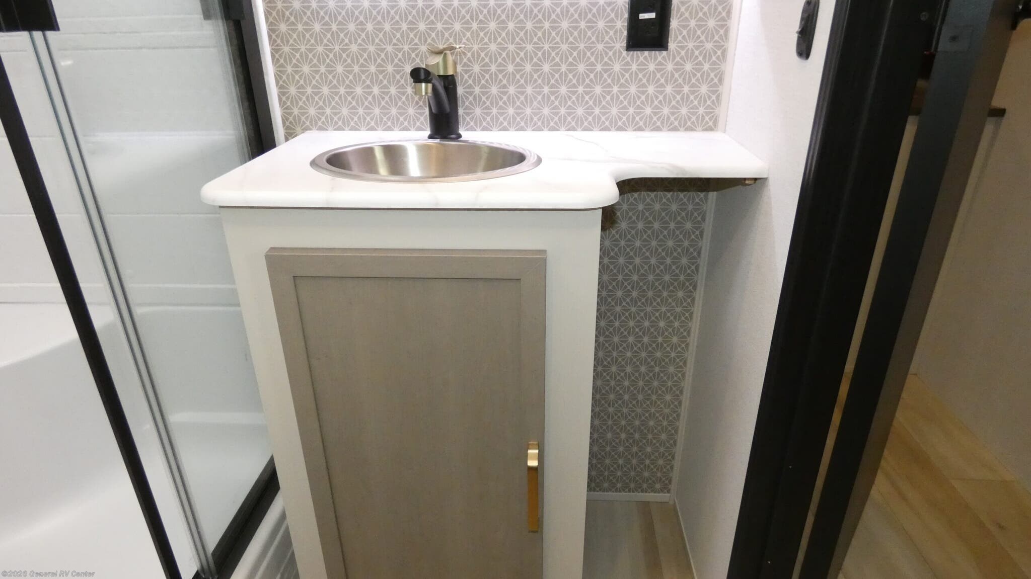 Forest River Wildwood Heritage Glen travel trailer 308RL highlights: Custom King Bed Kitchen Island Panoramic Windows Theatre Seating Exterior Shower Two Awnings You are going to love the spacious private bedroom with a space-saving door, custom king bed slide, a dresser, and a full-width wardrobe with washer and dryer prep. If you ever decide to get out of bed, you can enjoy a relaxing shower in the residential shower with a skylight and a wide-open kitchen and living area with dual opposing slide outs. The cook will love having a kitchen island, a hutch, a large pantry, plus a 12V refrigerator. There is an entertainment center with a 50" TV and fireplace plus plenty of seating on the furniture. And don't forget about the natural lighting and views you will receive from the panoramic windows. With any Wildwood Heritage Glen travel trailer by Forest River, the quality construction, attention to detail and design along with a bright and welcoming interior allows you to relax in comfort. Each model includes a WeatherShield one piece fiberglass roof, nitrogen-filled radial tires, and an enclosed underbelly with 12V tank heaters on all holding tanks for added protection. You will appreciate the on-demand tankless water heater, along with power stabilizer and tongue jacks, and an extra-large pass-thru storage with slam latch baggage doors. Head inside to enjoy matte gold hardware, wood door casings in place of plastic door casings, and an ultimate interior lighting upgrade with 4k puck/strip lights and a stylish LED back-lit bath mirror!