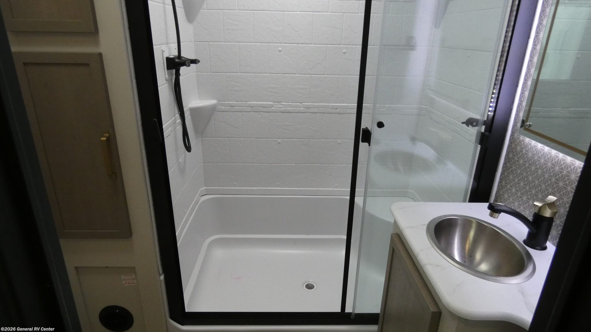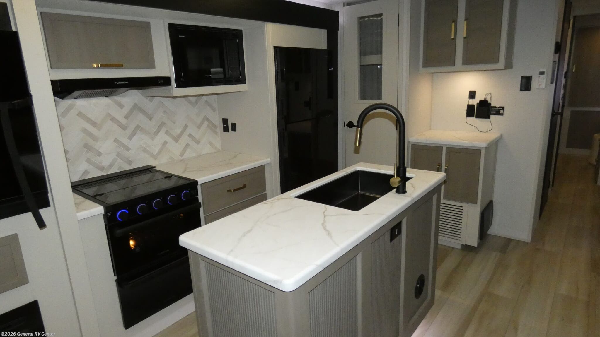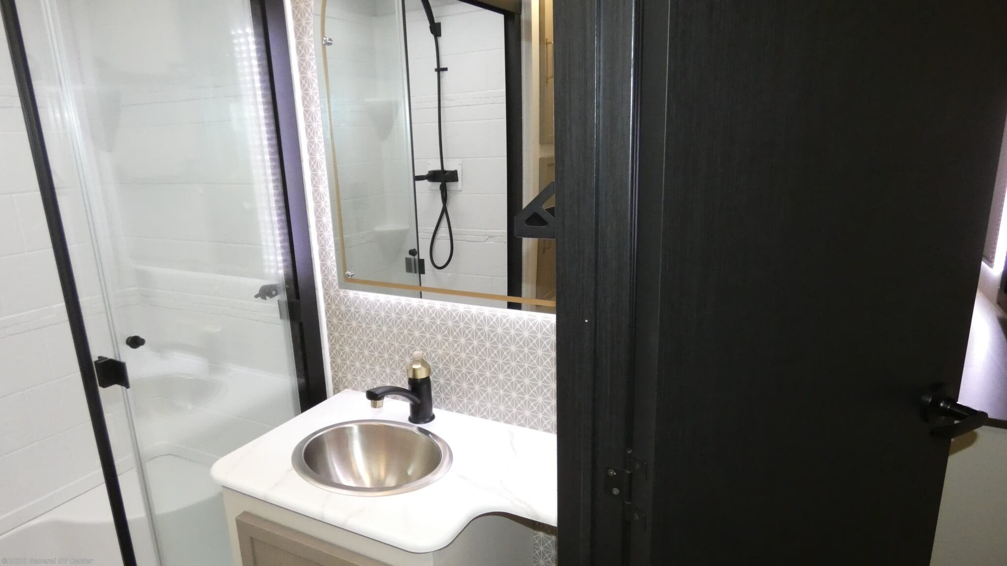 Forest River Wildwood Heritage Glen travel trailer 308RL highlights: Custom King Bed Kitchen Island Panoramic Windows Theatre Seating Exterior Shower Two Awnings You are going to love the spacious private bedroom with a space-saving door, custom king bed slide, a dresser, and a full-width wardrobe with washer and dryer prep. If you ever decide to get out of bed, you can enjoy a relaxing shower in the residential shower with a skylight and a wide-open kitchen and living area with dual opposing slide outs. The cook will love having a kitchen island, a hutch, a large pantry, plus a 12V refrigerator. There is an entertainment center with a 50" TV and fireplace plus plenty of seating on the furniture. And don't forget about the natural lighting and views you will receive from the panoramic windows. With any Wildwood Heritage Glen travel trailer by Forest River, the quality construction, attention to detail and design along with a bright and welcoming interior allows you to relax in comfort. Each model includes a WeatherShield one piece fiberglass roof, nitrogen-filled radial tires, and an enclosed underbelly with 12V tank heaters on all holding tanks for added protection. You will appreciate the on-demand tankless water heater, along with power stabilizer and tongue jacks, and an extra-large pass-thru storage with slam latch baggage doors. Head inside to enjoy matte gold hardware, wood door casings in place of plastic door casings, and an ultimate interior lighting upgrade with 4k puck/strip lights and a stylish LED back-lit bath mirror!