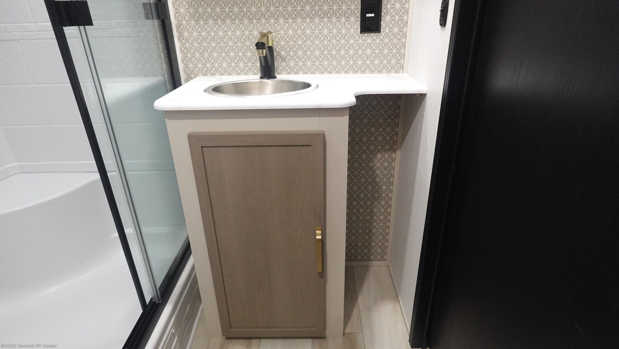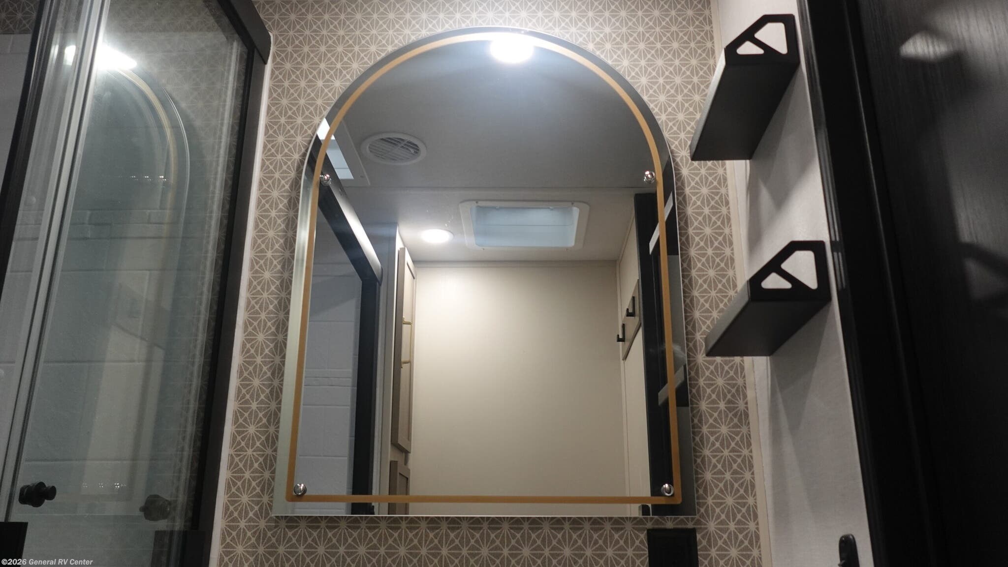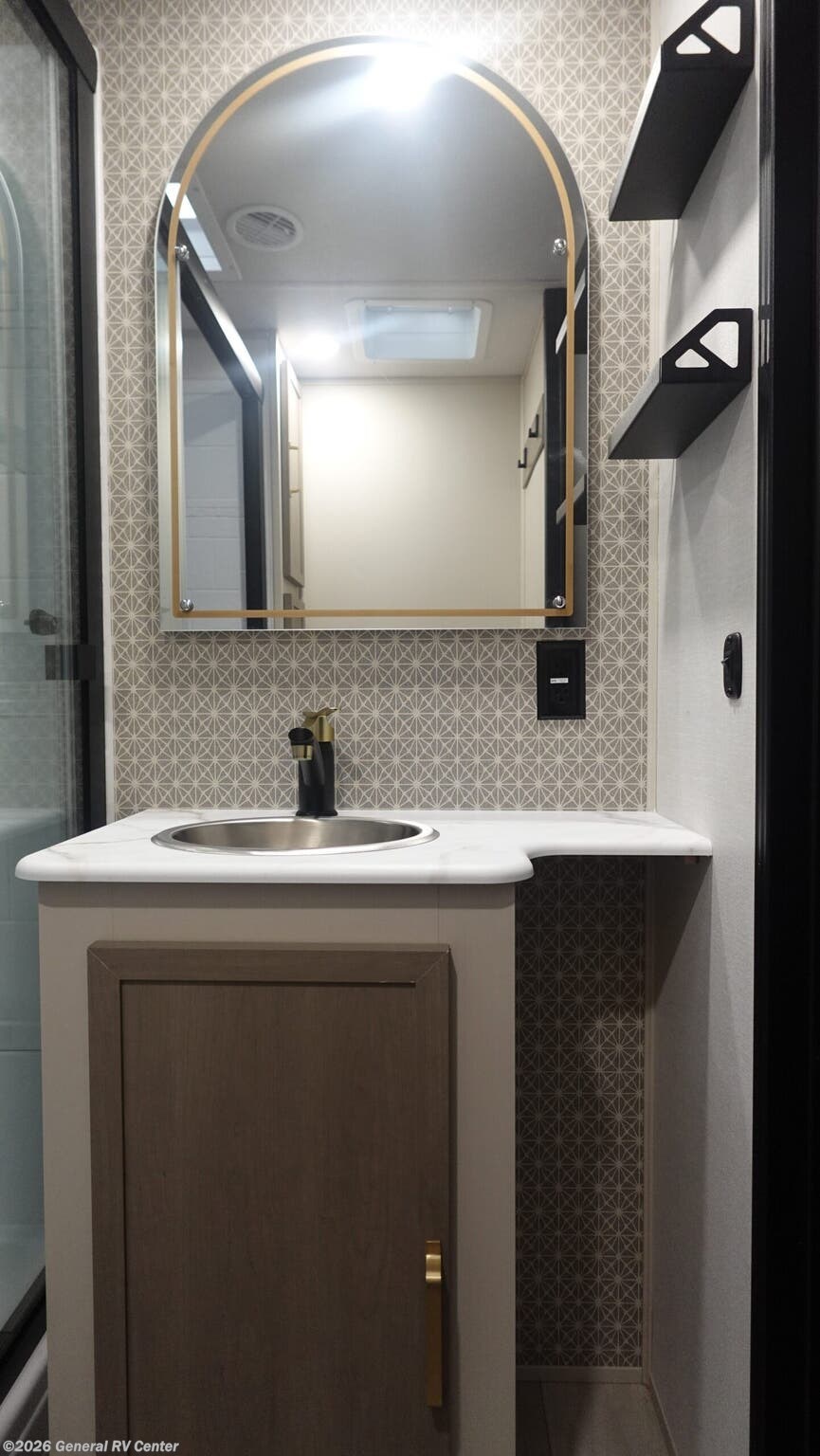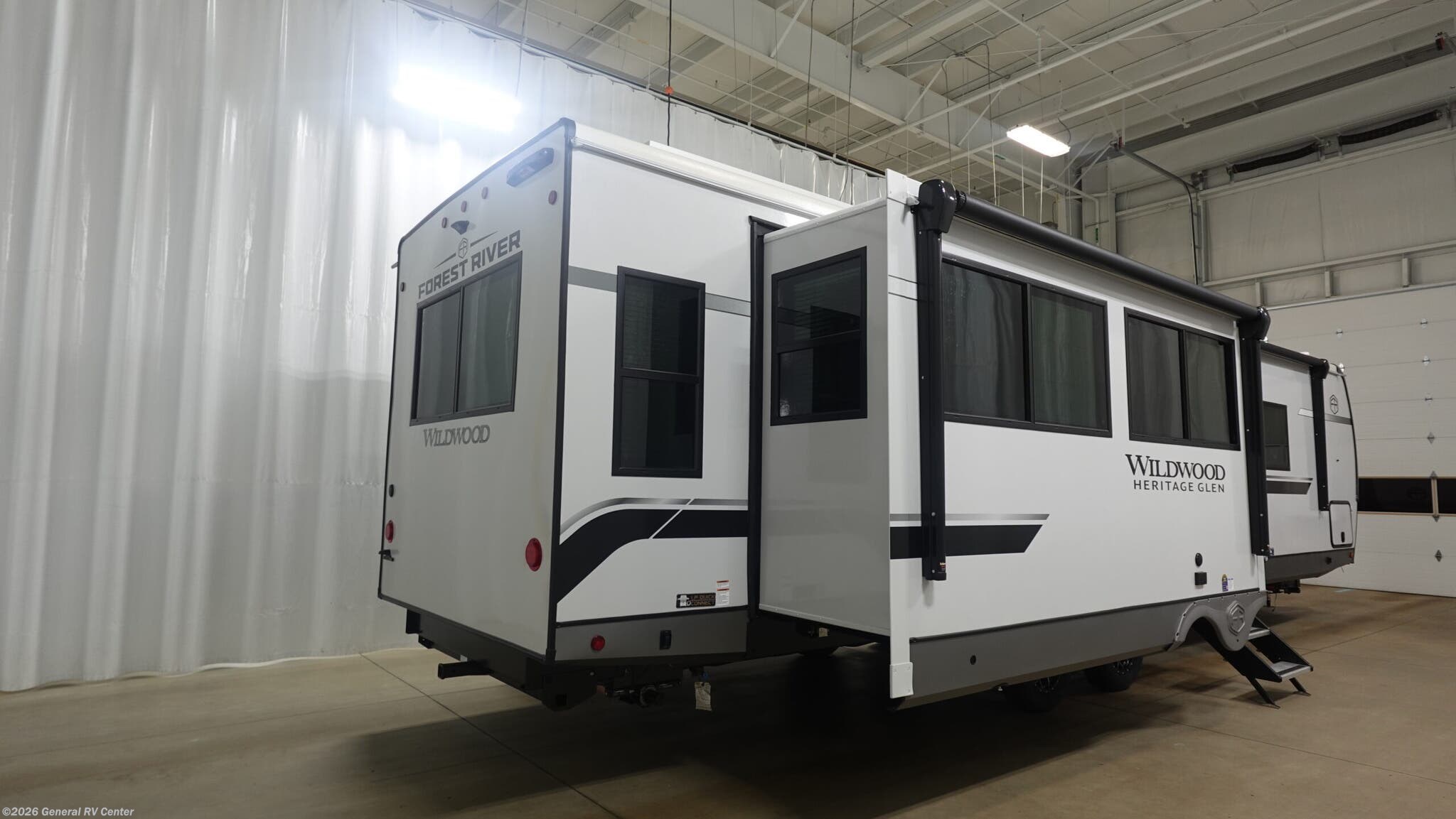 Forest River Wildwood Heritage Glen travel trailer 308RL highlights: Custom King Bed Kitchen Island Panoramic Windows Theatre Seating Exterior Shower Two Awnings You are going to love the spacious private bedroom with a space-saving door, custom king bed slide, a dresser, and a full-width wardrobe with washer and dryer prep. If you ever decide to get out of bed, you can enjoy a relaxing shower in the residential shower with a skylight and a wide-open kitchen and living area with dual opposing slide outs. The cook will love having a kitchen island, a hutch, a large pantry, plus a 12V refrigerator. There is an entertainment center with a 50" TV and fireplace plus plenty of seating on the furniture. You can dine at the free-standing dinette if you prefer having your own seat. And don't forget about the natural lighting and views you will receive from the panoramic windows. With any Wildwood Heritage Glen travel trailer by Forest River, the quality construction, attention to detail and design along with a bright and welcoming interior allows you to relax in comfort. Each model includes a WeatherShield one piece fiberglass roof, nitrogen-filled radial tires, and an enclosed underbelly with 12V tank heaters on all holding tanks for added protection. You will appreciate the on-demand tankless water heater, along with power stabilizer and tongue jacks, and an extra-large pass-thru storage with slam latch baggage doors. Head inside to enjoy matte gold hardware, wood door casings in place of plastic door casings, and an ultimate interior lighting upgrade with 4k puck/strip lights and a stylish LED back-lit bath mirror!