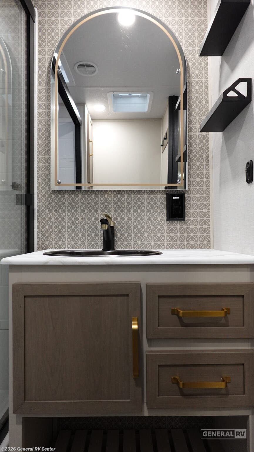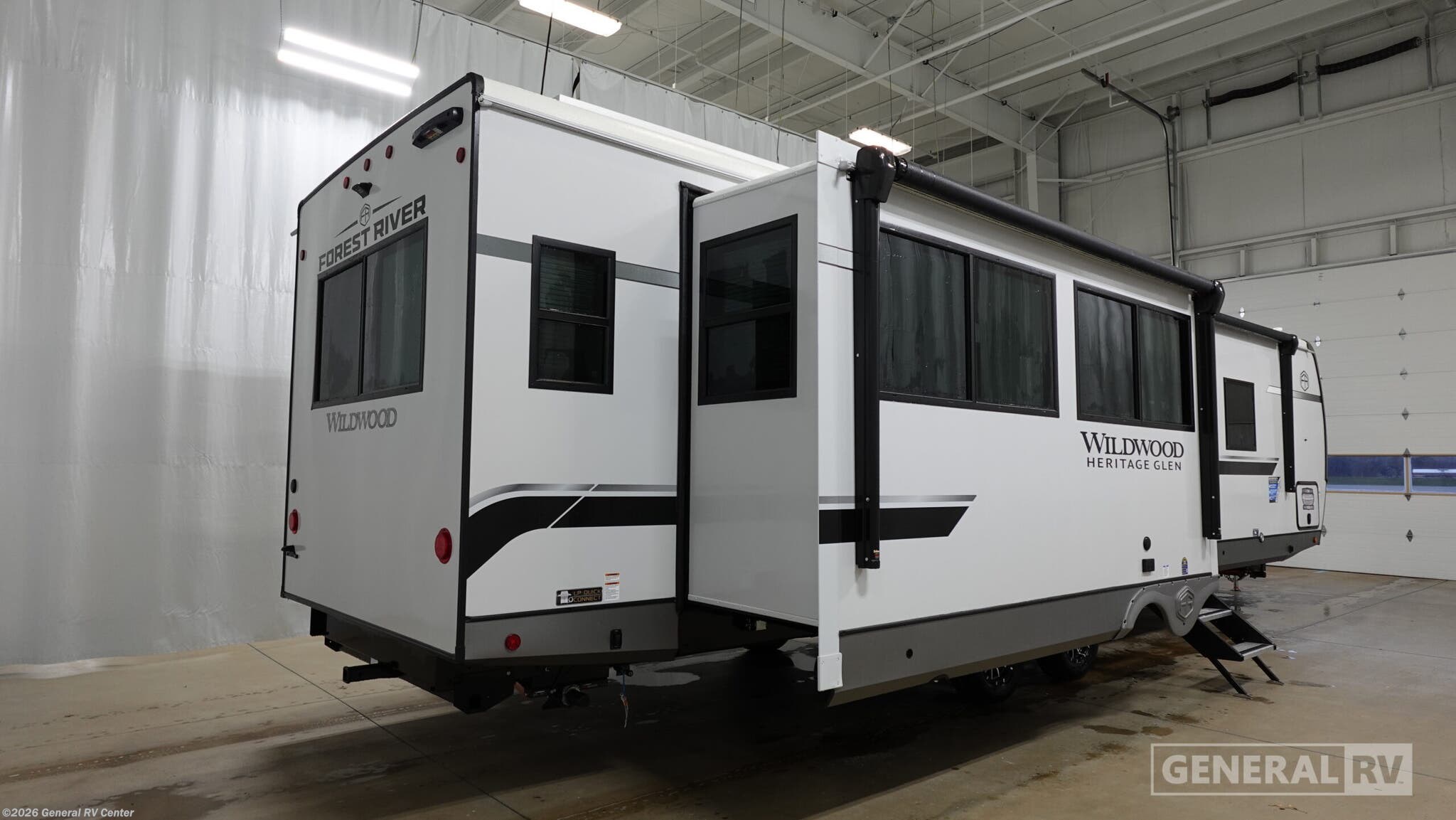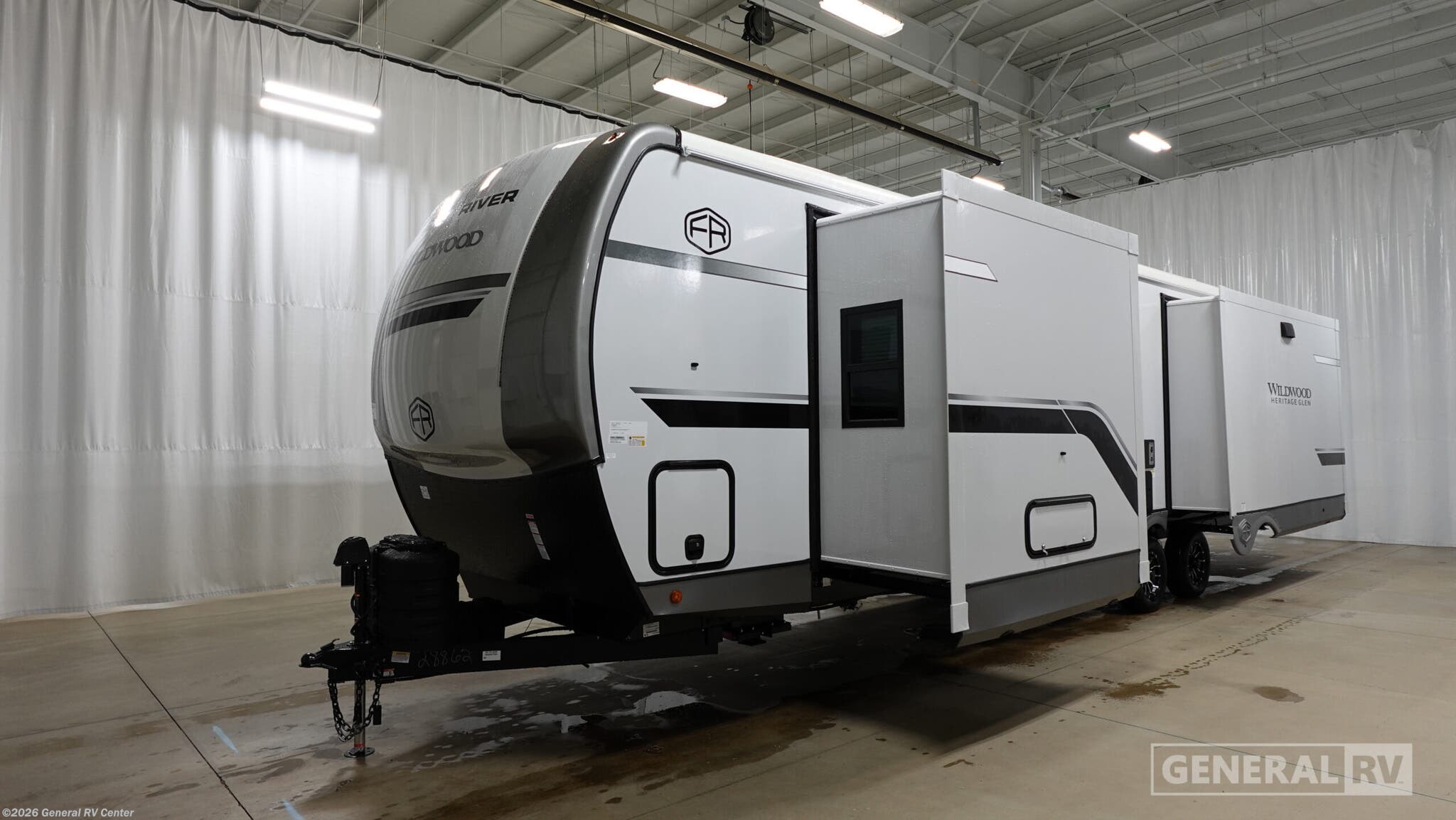 **Forest River Wildwood Heritage Glen travel trailer 308RL highlights:** * Custom King Bed * Kitchen Island * Panoramic Windows * Theatre Seating * Exterior Shower * Two Awnings You are going to love the spacious private bedroom with a space-saving door, custom king bed slide, a dresser, and a full-width wardrobe with washer and dryer prep. If you ever decide to get out of bed, you can enjoy a relaxing shower in the residential shower with a skylight and a wide-open kitchen and living area with dual opposing slide outs. The cook will love having a kitchen island, a hutch, a large pantry, plus a 12V refrigerator. There is an entertainment center with a 50" TV and fireplace plus plenty of seating on the furniture. You can dine at the booth dinette or choose to add the free-standing dinette option if you prefer having your own seat. And don't forget about the natural lighting and views you will receive from the panoramic windows. With any Wildwood Heritage Glen travel trailer by Forest River, the quality construction, attention to detail and design along with a bright and welcoming interior allows you to relax in comfort. Each model includes a WeatherShield one piece fiberglass roof, nitrogen-filled radial tires, and an enclosed underbelly with 12V tank heaters on all holding tanks for added protection. You will appreciate the on-demand tankless water heater, along with power stabilizer and tongue jacks, and an extra-large pass-thru storage with slam latch baggage doors. Head inside to enjoy matte gold hardware, wood door casings in place of plastic door casings, and an ultimate interior lighting upgrade with 4k puck/strip lights and a stylish LED back-lit bath mirror!