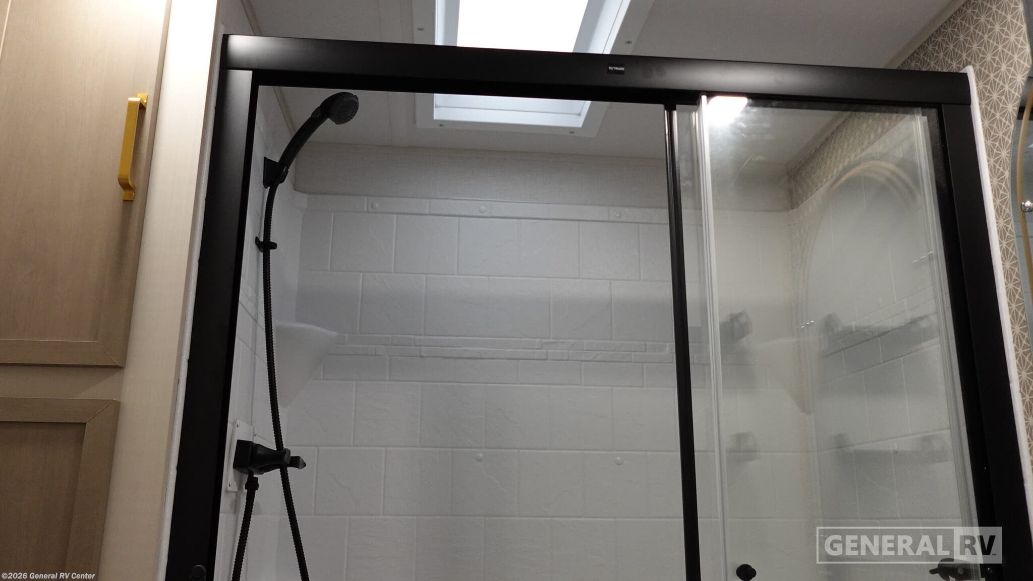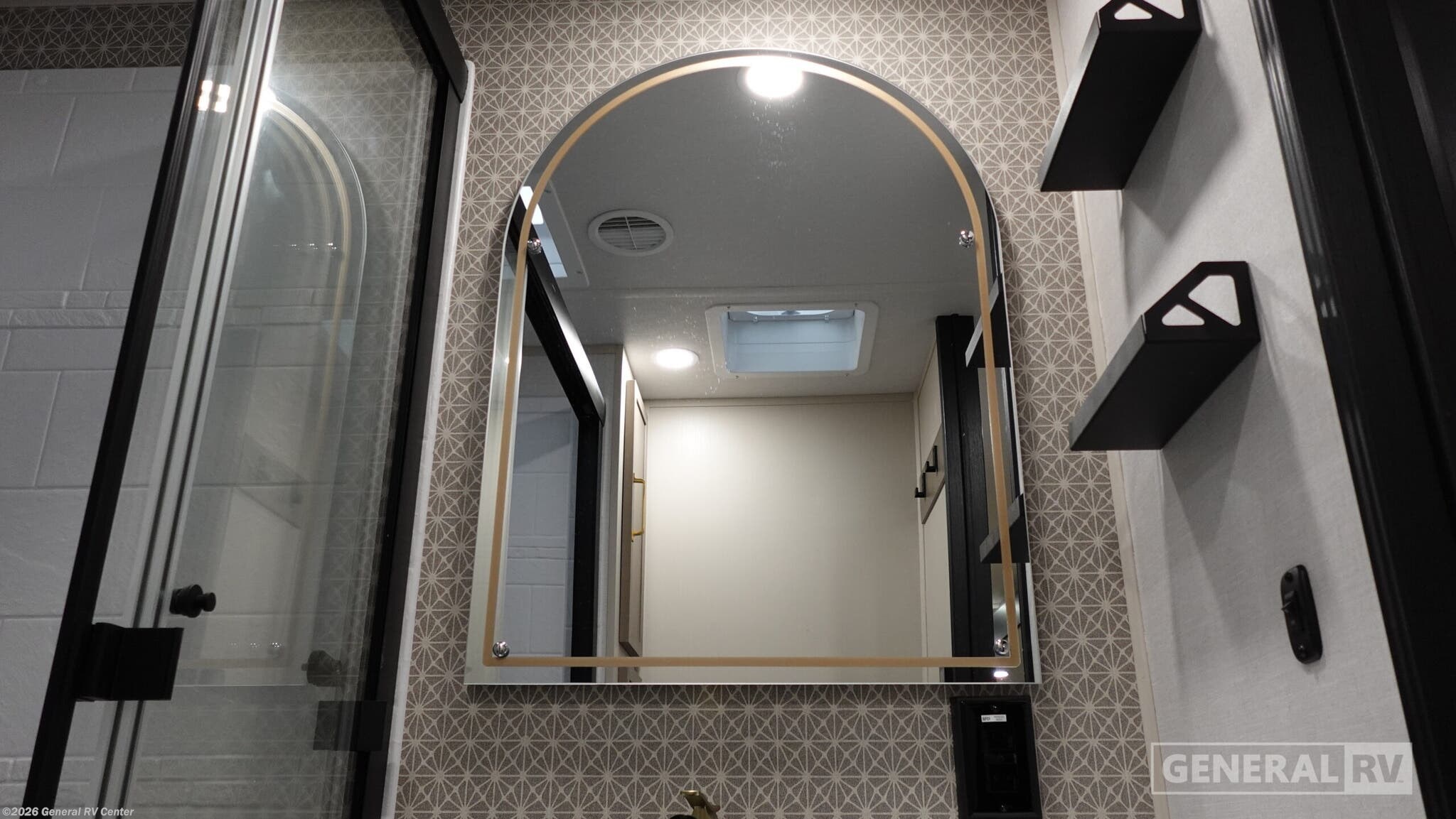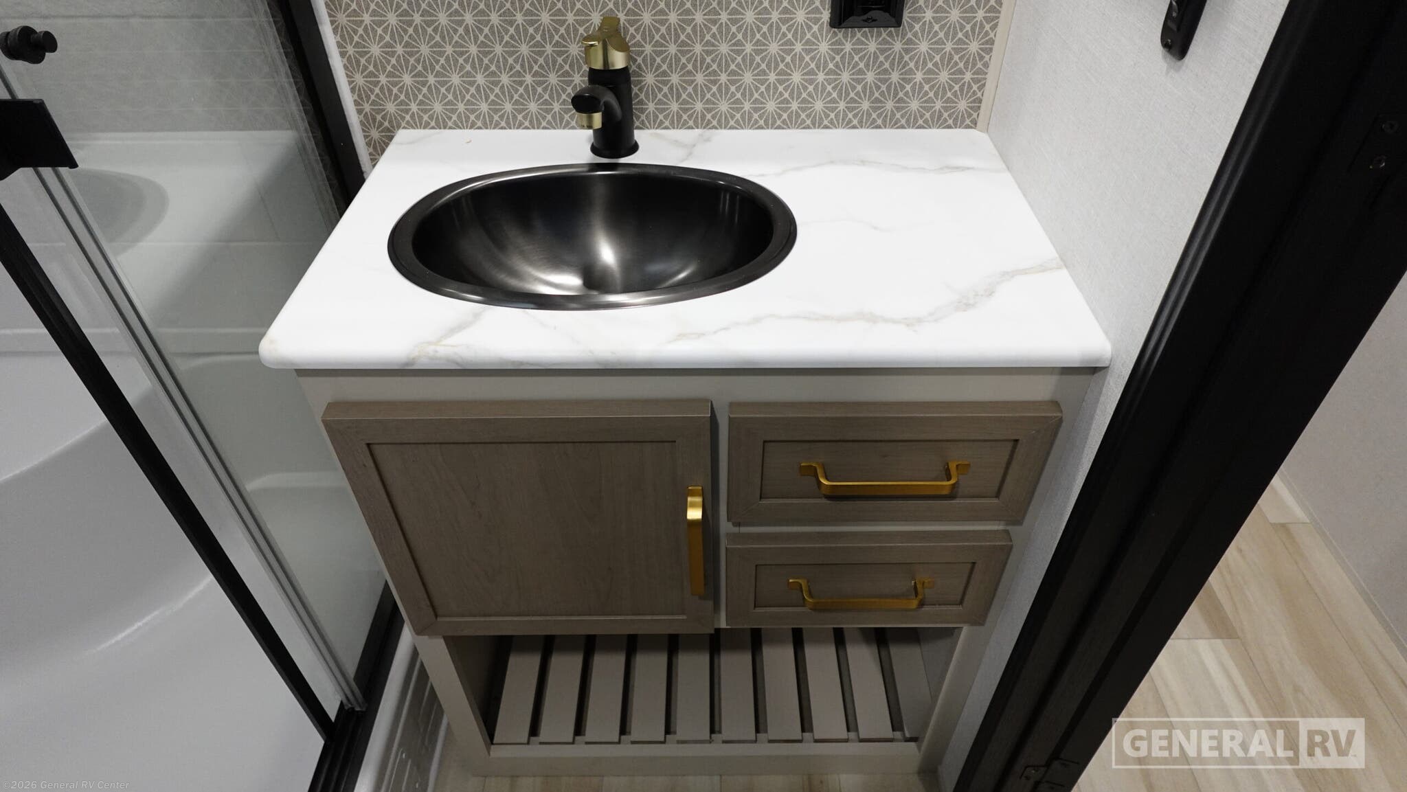 **Forest River Wildwood Heritage Glen travel trailer 308RL highlights:** * Custom King Bed * Kitchen Island * Panoramic Windows * Theatre Seating * Exterior Shower * Two Awnings You are going to love the spacious private bedroom with a space-saving door, custom king bed slide, a dresser, and a full-width wardrobe with washer and dryer prep. If you ever decide to get out of bed, you can enjoy a relaxing shower in the residential shower with a skylight and a wide-open kitchen and living area with dual opposing slide outs. The cook will love having a kitchen island, a hutch, a large pantry, plus a 12V refrigerator. There is an entertainment center with a 50" TV and fireplace plus plenty of seating on the furniture. You can dine at the booth dinette or choose to add the free-standing dinette option if you prefer having your own seat. And don't forget about the natural lighting and views you will receive from the panoramic windows. With any Wildwood Heritage Glen travel trailer by Forest River, the quality construction, attention to detail and design along with a bright and welcoming interior allows you to relax in comfort. Each model includes a WeatherShield one piece fiberglass roof, nitrogen-filled radial tires, and an enclosed underbelly with 12V tank heaters on all holding tanks for added protection. You will appreciate the on-demand tankless water heater, along with power stabilizer and tongue jacks, and an extra-large pass-thru storage with slam latch baggage doors. Head inside to enjoy matte gold hardware, wood door casings in place of plastic door casings, and an ultimate interior lighting upgrade with 4k puck/strip lights and a stylish LED back-lit bath mirror!