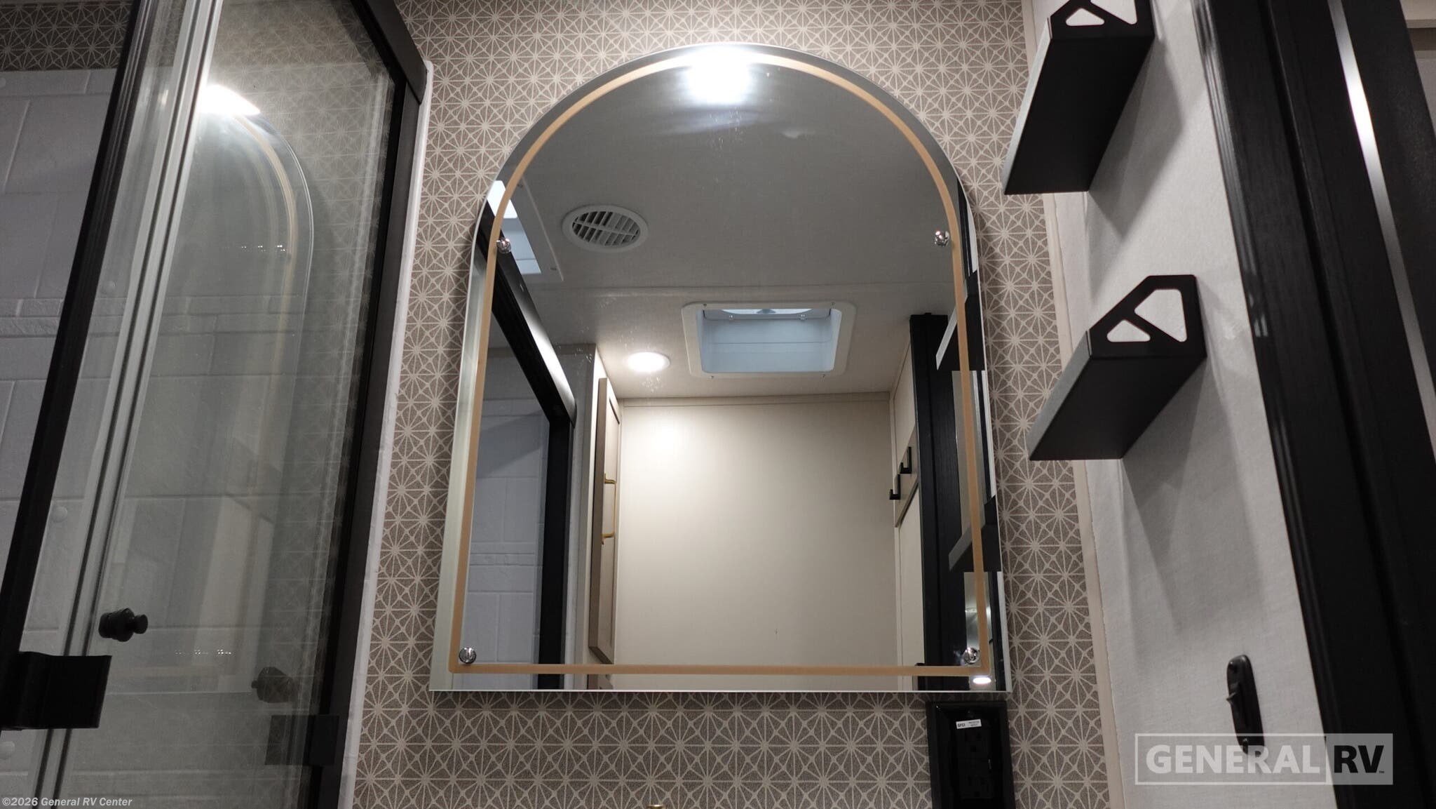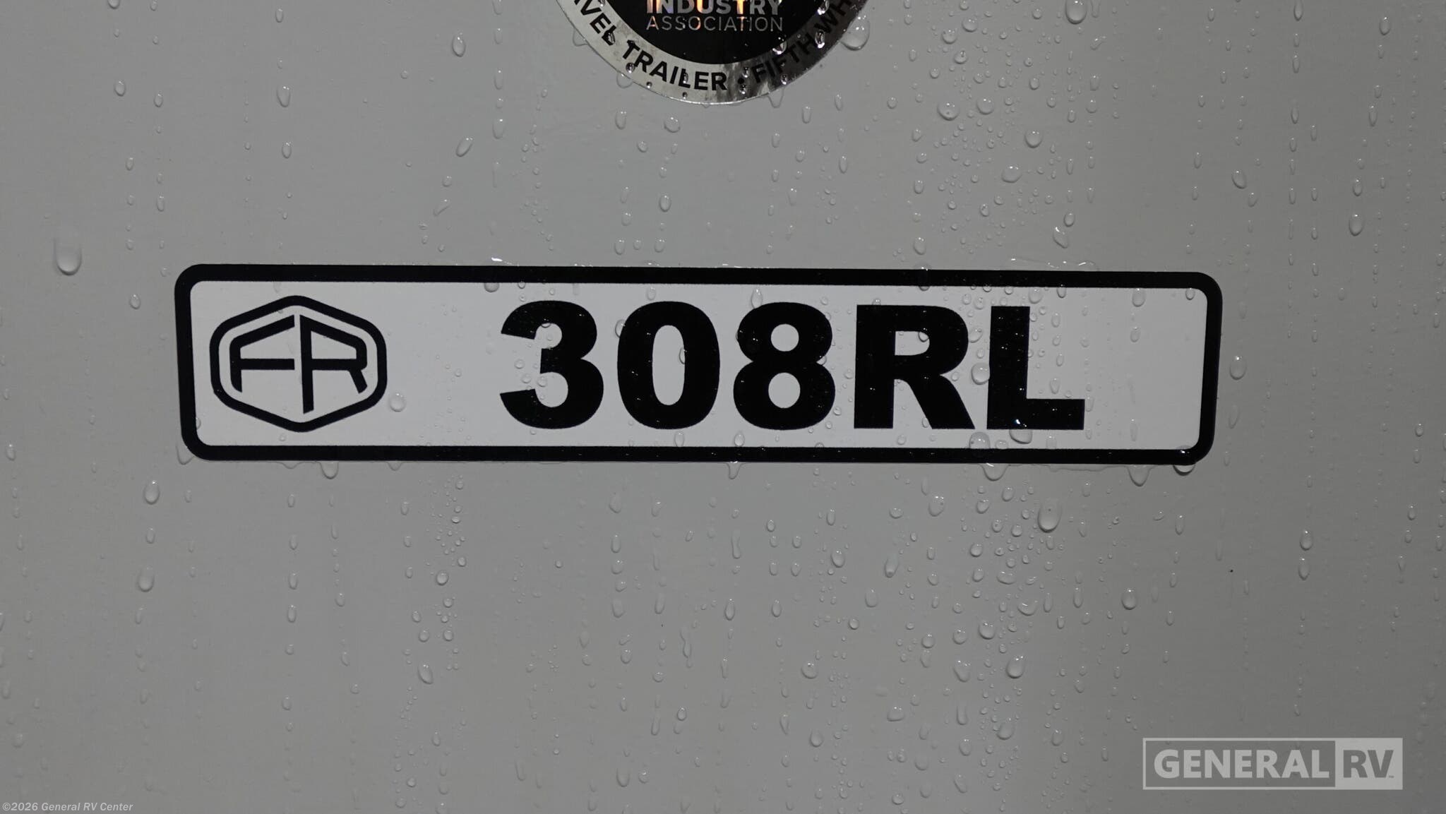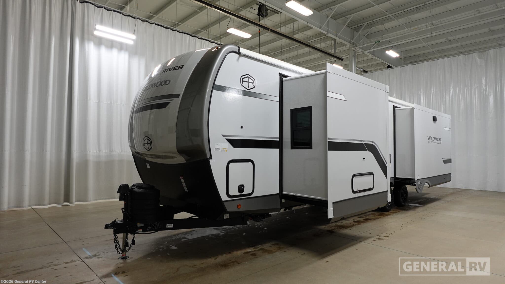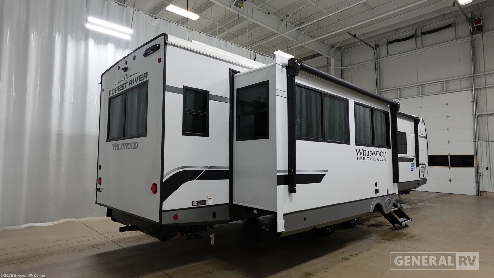 Forest River Wildwood Heritage Glen travel trailer 308RL highlights: Custom King Bed Kitchen Island Panoramic Windows Theatre Seating Exterior Shower Two Awnings You are going to love the spacious private bedroom with a space-saving door, custom king bed slide, a dresser, and a full-width wardrobe with washer and dryer prep. If you ever decide to get out of bed, you can enjoy a relaxing shower in the residential shower with a skylight and a wide-open kitchen and living area with dual opposing slide outs. The cook will love having a kitchen island, a hutch, a large pantry, plus a 12V refrigerator. There is an entertainment center with a 50" TV and fireplace plus plenty of seating on the furniture. And don't forget about the natural lighting and views you will receive from the panoramic windows. With any Wildwood Heritage Glen travel trailer by Forest River, the quality construction, attention to detail and design along with a bright and welcoming interior allows you to relax in comfort. Each model includes a WeatherShield one piece fiberglass roof, nitrogen-filled radial tires, and an enclosed underbelly with 12V tank heaters on all holding tanks for added protection. You will appreciate the on-demand tankless water heater, along with power stabilizer and tongue jacks, and an extra-large pass-thru storage with slam latch baggage doors. Head inside to enjoy matte gold hardware, wood door casings in place of plastic door casings, and an ultimate interior lighting upgrade with 4k puck/strip lights and a stylish LED back-lit bath mirror!