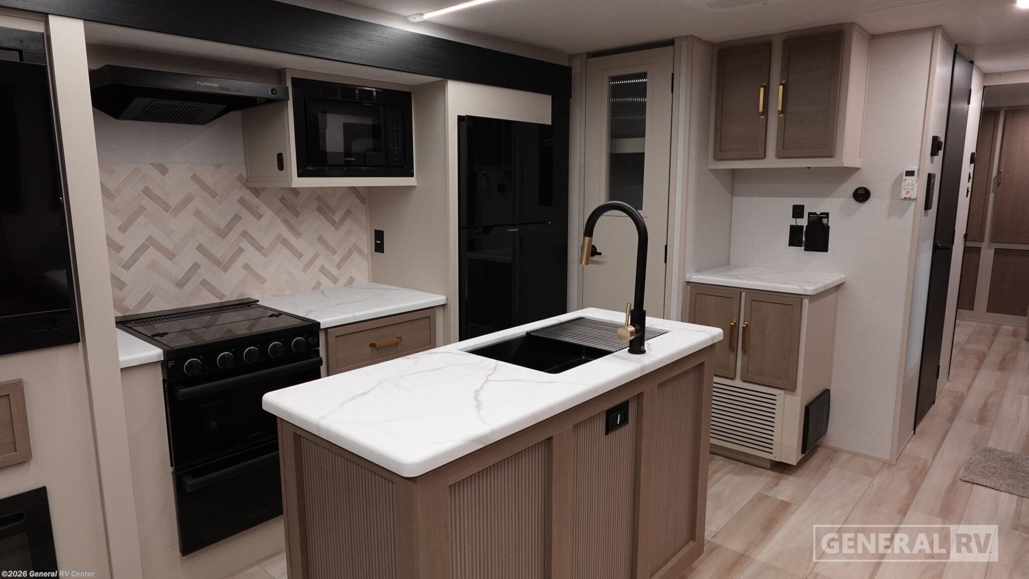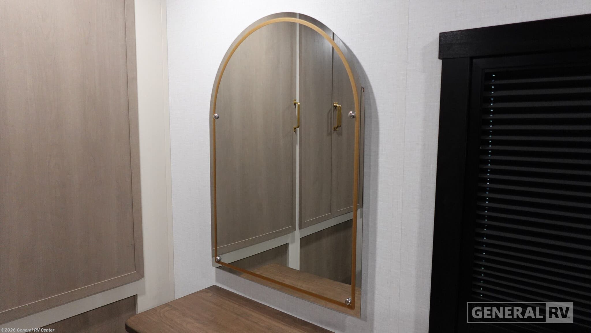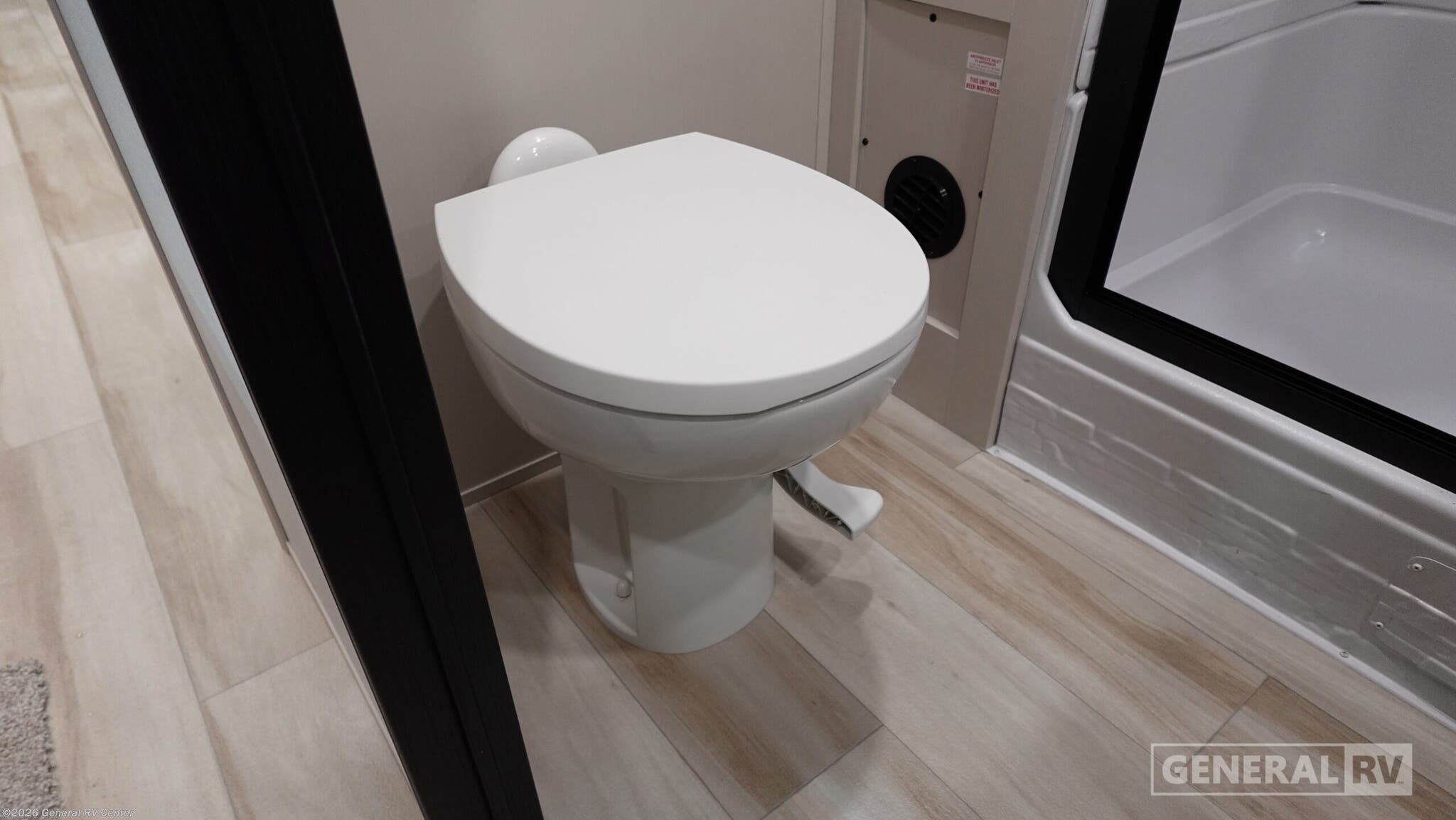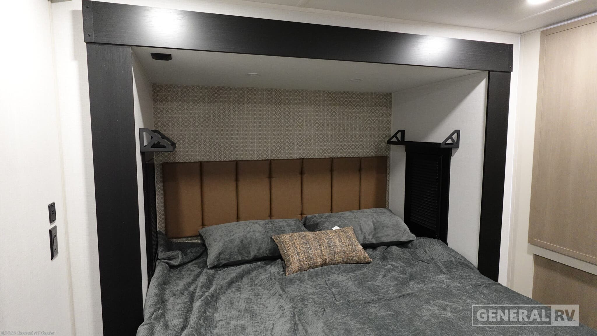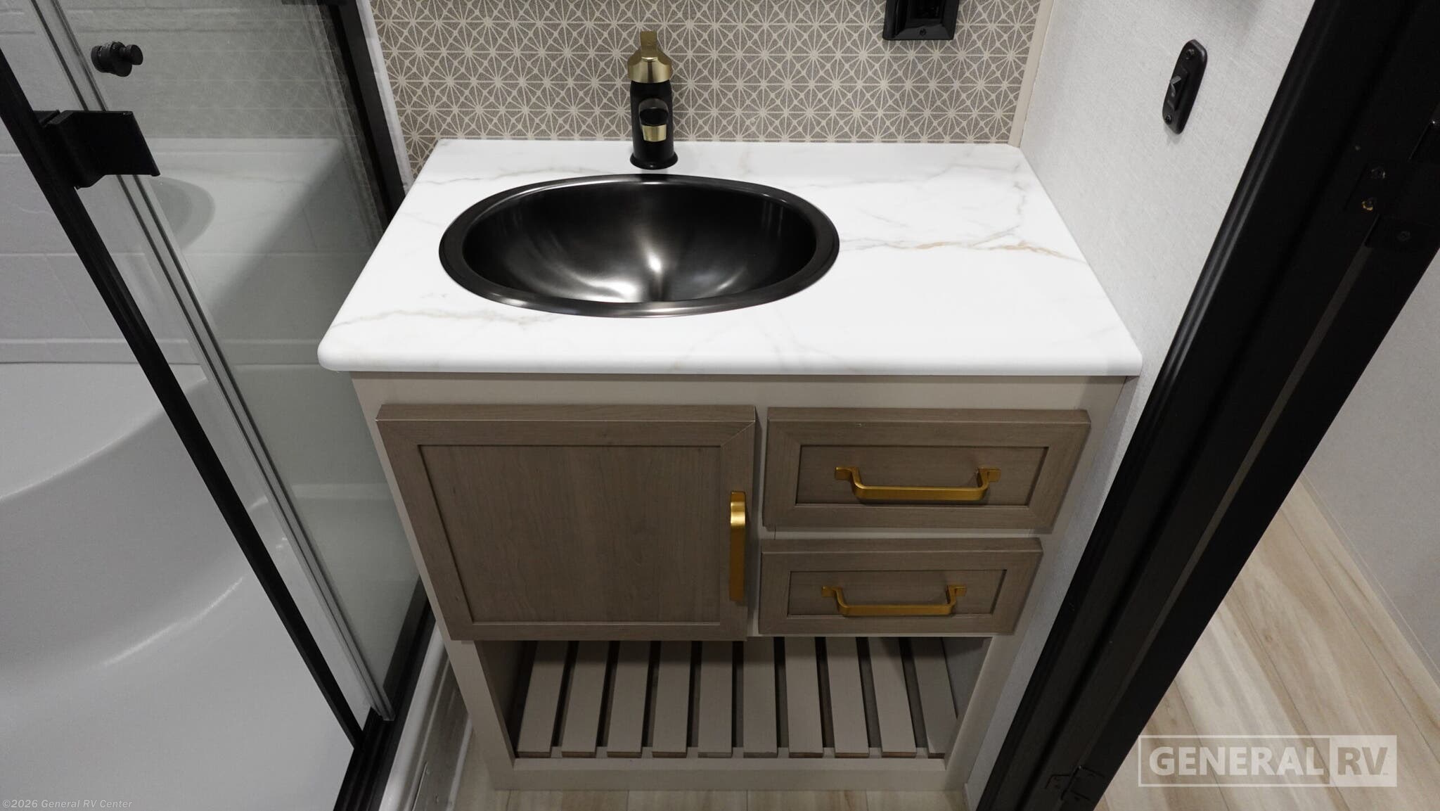 Forest River Wildwood Heritage Glen travel trailer 308RL highlights: Custom King Bed Kitchen Island Panoramic Windows Theatre Seating Exterior Shower Two Awnings You are going to love the spacious private bedroom with a space-saving door, custom king bed slide, a dresser, and a full-width wardrobe with washer and dryer prep. If you ever decide to get out of bed, you can enjoy a relaxing shower in the residential shower with a skylight and a wide-open kitchen and living area with dual opposing slide outs. The cook will love having a kitchen island, a hutch, a large pantry, plus a 12V refrigerator. There is an entertainment center with a 50" TV and fireplace plus plenty of seating on the furniture. And don't forget about the natural lighting and views you will receive from the panoramic windows. With any Wildwood Heritage Glen travel trailer by Forest River, the quality construction, attention to detail and design along with a bright and welcoming interior allows you to relax in comfort. Each model includes a WeatherShield one piece fiberglass roof, nitrogen-filled radial tires, and an enclosed underbelly with 12V tank heaters on all holding tanks for added protection. You will appreciate the on-demand tankless water heater, along with power stabilizer and tongue jacks, and an extra-large pass-thru storage with slam latch baggage doors. Head inside to enjoy matte gold hardware, wood door casings in place of plastic door casings, and an ultimate interior lighting upgrade with 4k puck/strip lights and a stylish LED back-lit bath mirror!